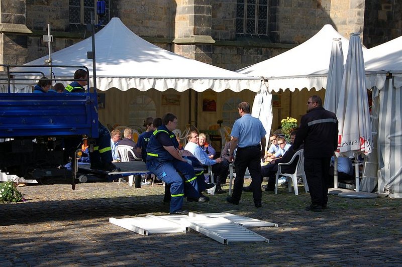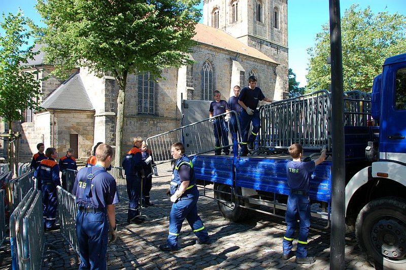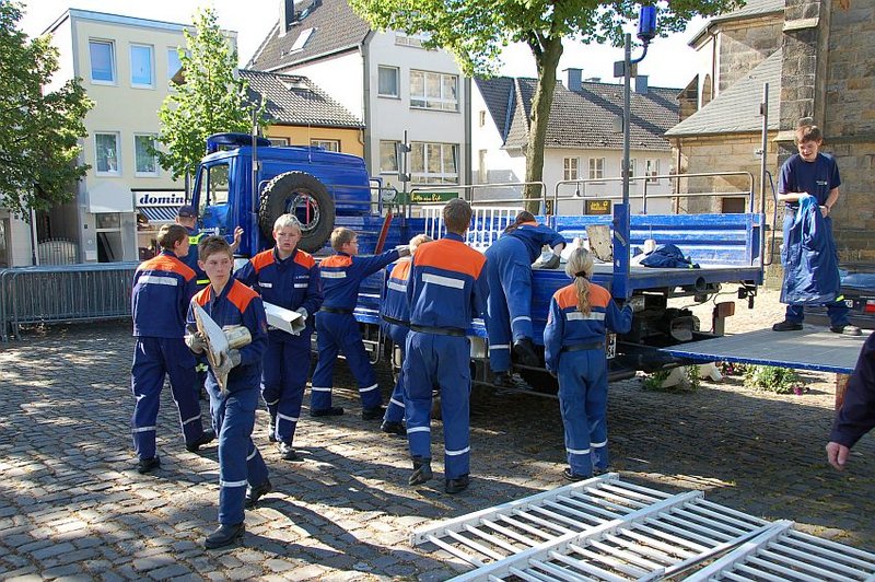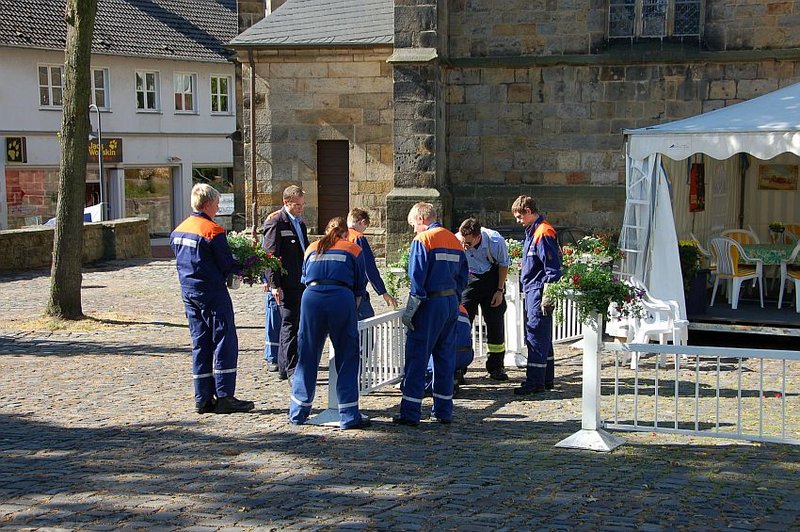 Zu den Aufgaben der Hilfskräfte gehört es die Streckenführung vom Rathaus aus durch die Ibbenbürener Innenstadt aufzubauen. Dazu werden reichlich "Demogitter" sowie Manpower benötigt.