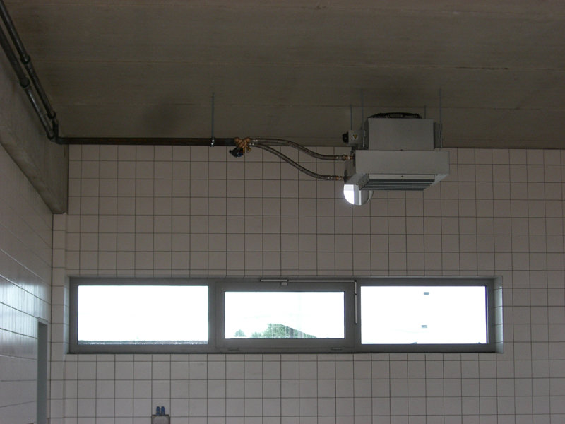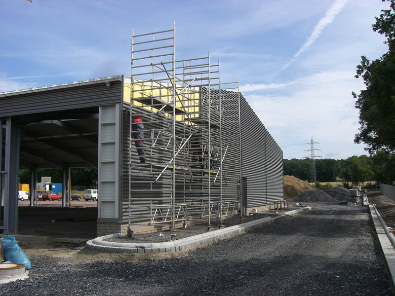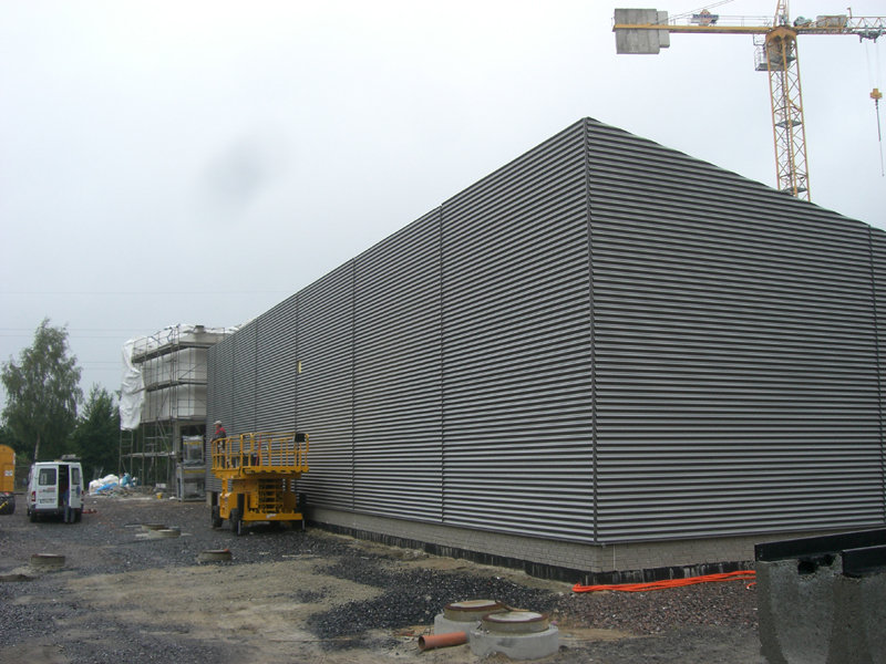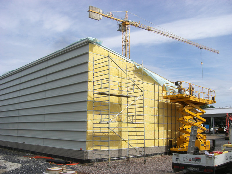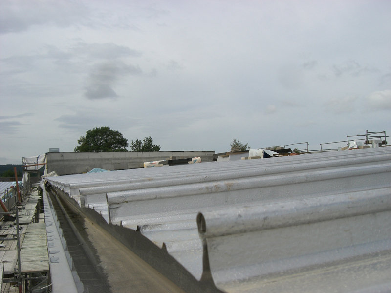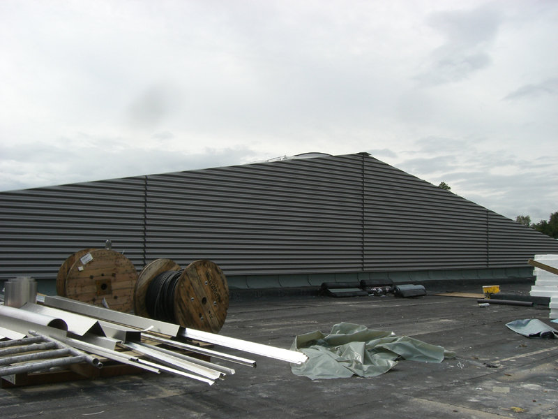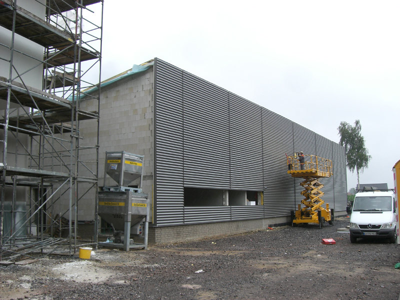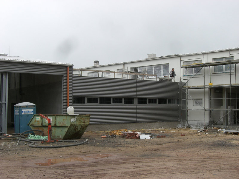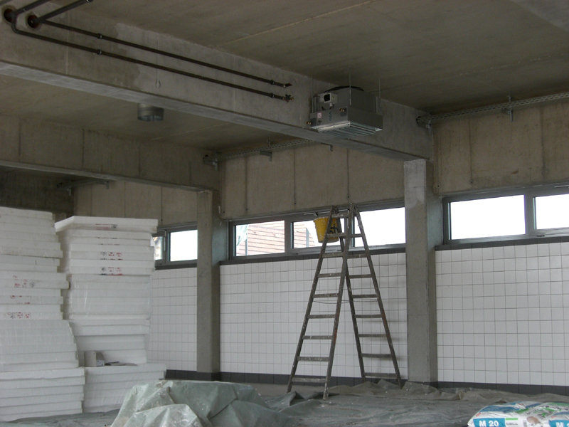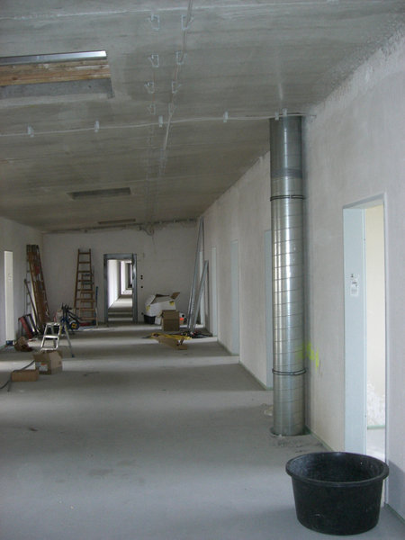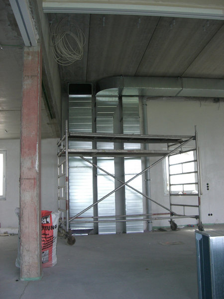 Im großen Schulungsraum wird die Lüftungsanlage eingebaut. Außen am Gebäude ist der Endanstrich so gut wie fertig. Ebenso werden die letzten Sinusbleche an der Außenfassade angebracht.