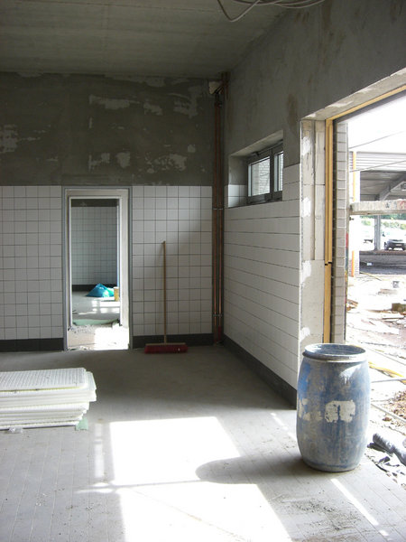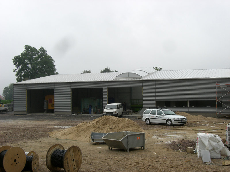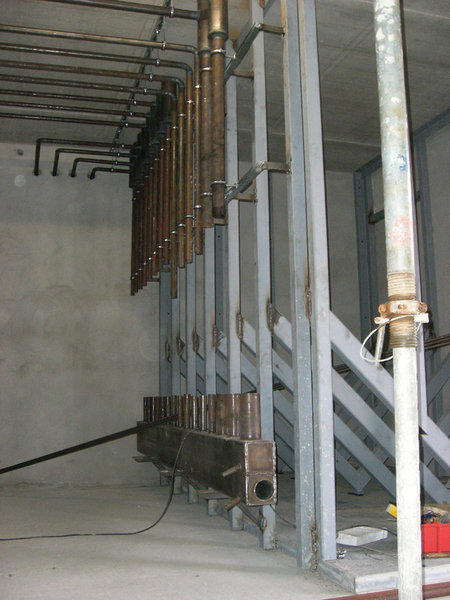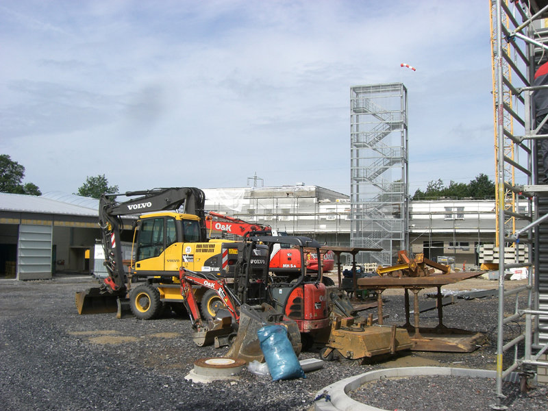 Auf der Baustelle geht es nach wie vor rund: im Gebäude werden weiterhin Leitungen für Strom, Steuerungen, Wasser und Heizung verlegt. Im Heizungsraum wird zur Zeit der Kohlebunker montiert, und auch der Kamin für die Kohleheizung ist bereits gezogen.