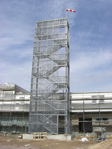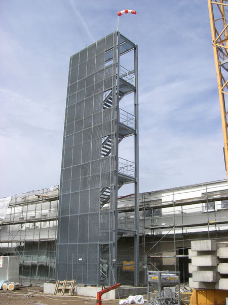 Der Übungsturm hat zur Hofseite noch eine Gitterrostverkleidung erhalten. Jetzt sind die simulierten Fensteröffnungen gut zu erkennen.