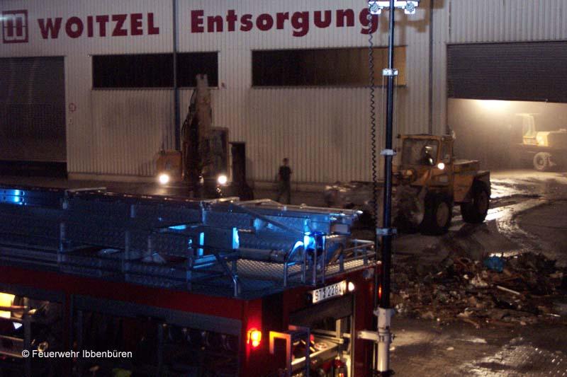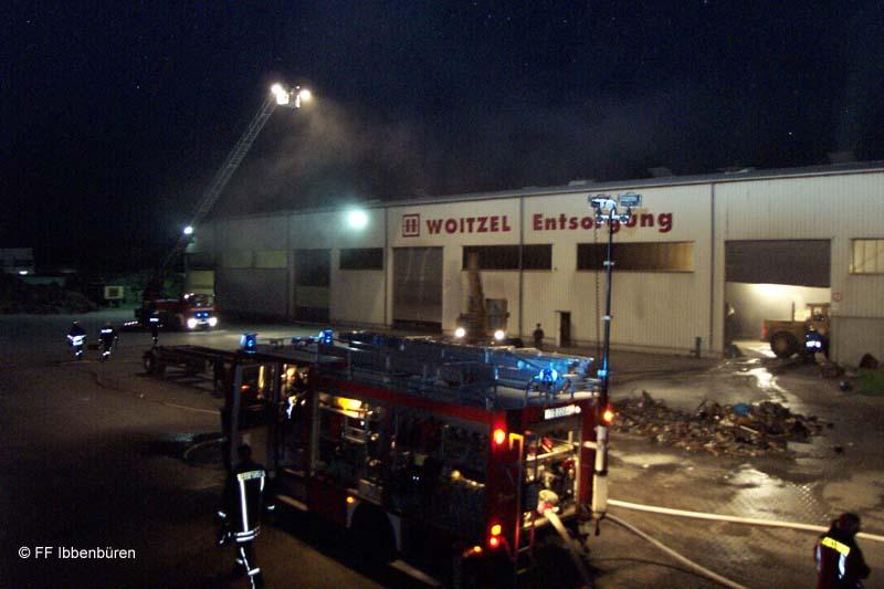 Am Montag wurde die Feuerwehr Ibbenbüren (LZ Stadtmitte 1 und 2) kurz nach 20 Uhr zu einem Brand bei der Entsorgungsfirma Woitzel, in Uffeln, gerufen.Die alarmierten Kräfte staunten nicht schlecht, denn sie saßen während der Alarmierung schon vollzählig auf den Fahrzeugen: es war nämlich regulärer Dienstabend, und die beiden Löschzüge standen abmarschbreit fertig. Nur dass es - statt wie geplant zum Aasee - nun zur Zeppelinstraße ging. Und dass es sich sich bei dem "pünktlichen" Alarm nicht um eine heiße Übung handelte, wurde spätestens auf der Anfahrt klar: eine weithin sichtbare Rauchfahne stand über dem Brandobjekt.