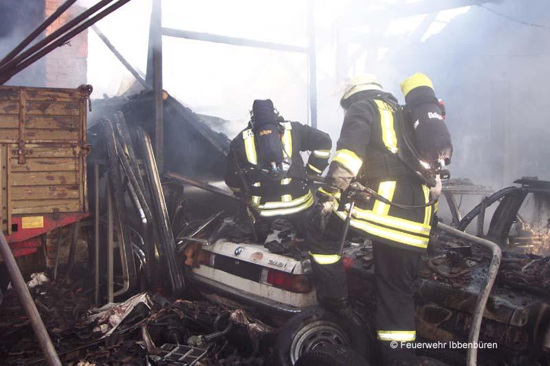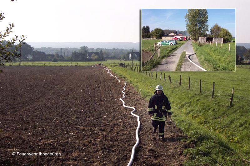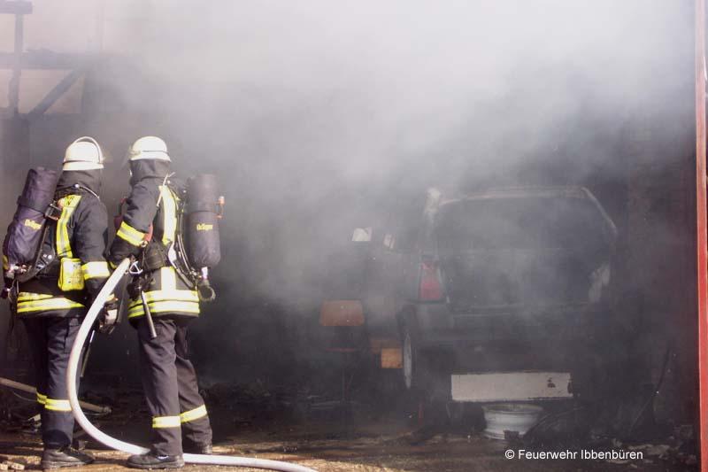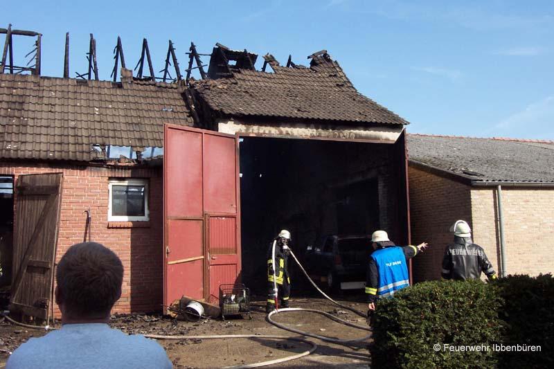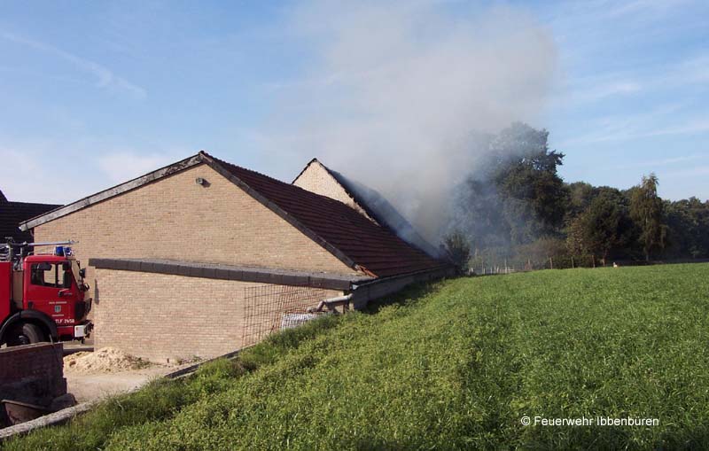 Nur einen Tag nach dem schweren Verkehrsunfall wurde die Feuerwehr Ibbenbüren erneut in den Ortsteil Püsselbüren alarmiert: am Mittwochvormittag gegen 10.35 Uhr war "Scheunenbrand" das Alarmstichwort. Diesmal für beide Züge Stadtmitte.Auf einem landwirtschaftlichen Anwesen war aus noch ungeklärter Ursache eine Scheune in Brand geraten. Sie wurde als Werkstatt bzw. Lager genutzt. Es waren u.a. mehrere Pkw und ein Anhänger dort untergestellt. Personen oder Tiere waren nicht in Gefahr.