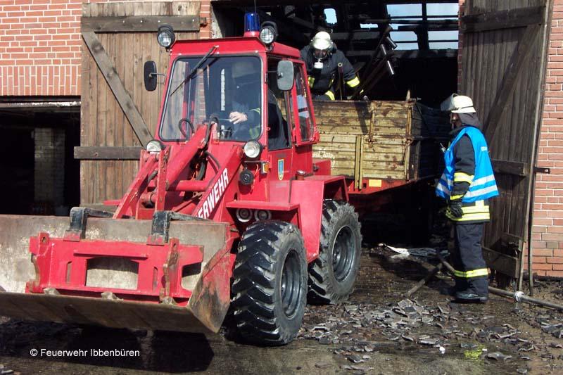 Um die Nachlöscharbeiten effektiv durchführen zu können, kam auch der feuerwehreigene Radlader wieder einmal zum Einsatz.