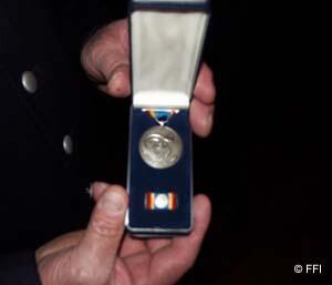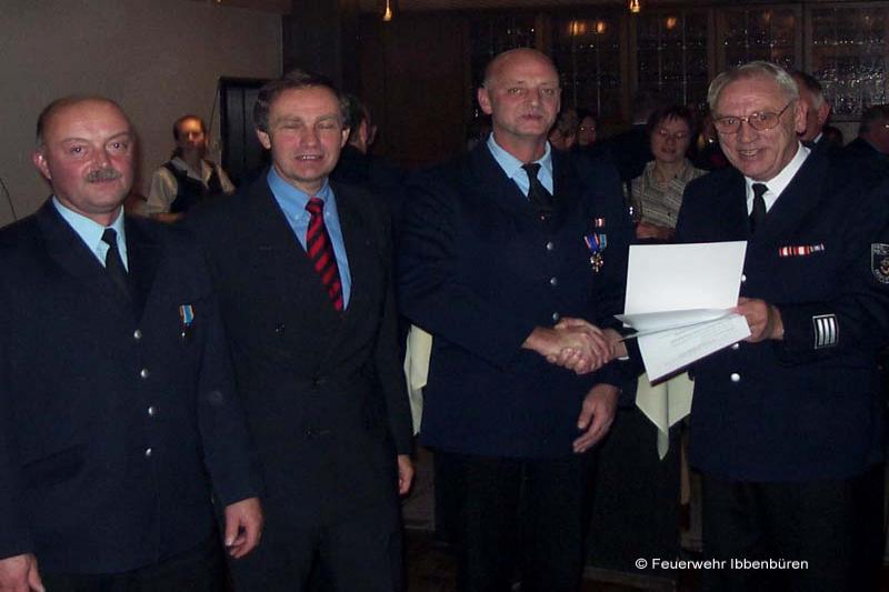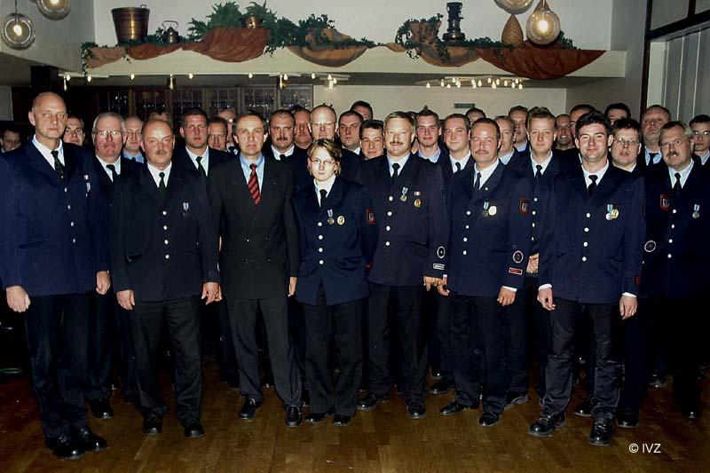 Nach dem Ausmarsch vom Neumarkt ging es im Schein der Fackeln zu Fuß zum Hotel Leugermann, wo dann - nicht öffentlich - das traditionelle Winterfest aller vier Löschzüge stattfand. Neben der gewohnt lockeren Stimmung beim Tanzen und am Buffet, konnte Bürgermeister Otto Lohmann eine besondere Ehrung vornehmen: Allen 46 Mitgliedern der Feuerwehr Ibbenbüren, die im August 2002 in unserer Partnerstadt Roßlau tatkräftige Hilfe im Kampf gegen das Elbehochwasser geleistet haben, wurde im Auftrag vom Bundesinnenminister die "Elbe-Flut-Medaille 2002" überreicht.