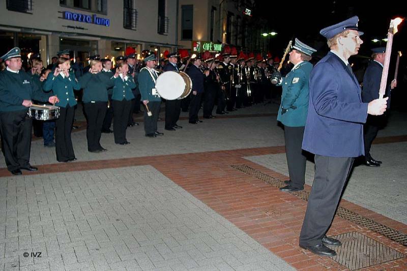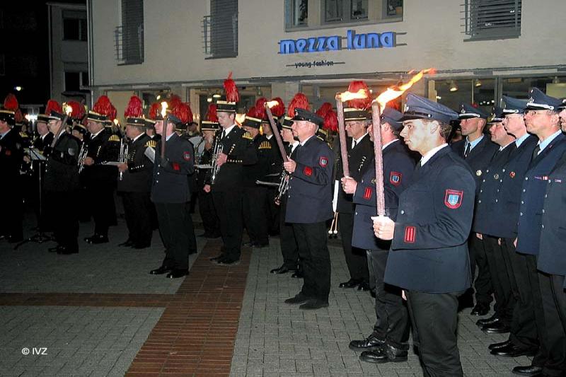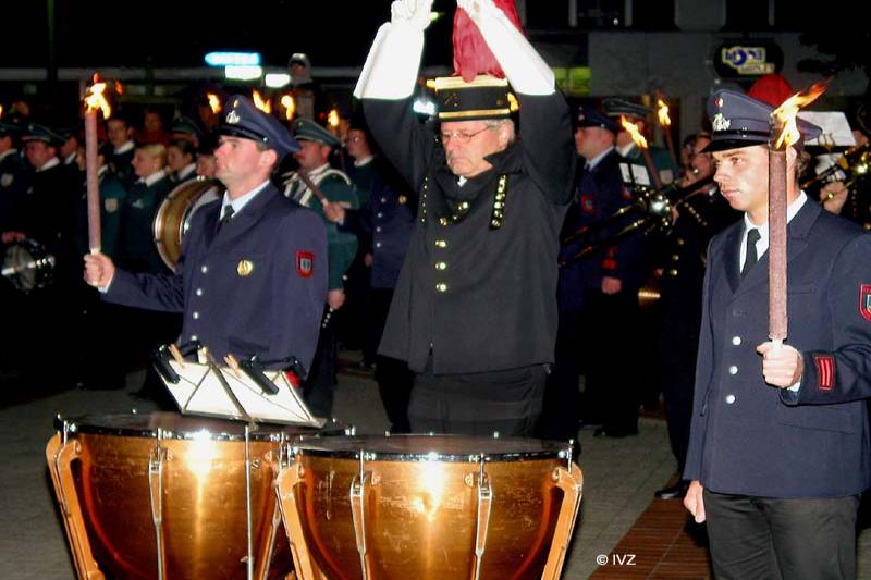 Mehrere Hundert Zuschauer sahen dann den Einmarsch der Spielleute und der Ehrenformation der Feuerwehr, flankiert von 36 Fakelträgern. Nach exakter Aufstellung in U-Form - der Ehrenzug geschlossen an der Stirnseite sowie rechts und links davon die übrigen Mitglieder der Aktiven Wehr, der Ehrenabteilung und der Jugendfeuerwehrwehr - erfolgte das Heraustreten einzelner Fackelträger. Diese formierten sich dann jeweils zu zweit neben der Wehrführung, dem Dirigenten und der Pauke. Alles angeführt durch die Kommandos von Christoph Börgel - Oberst der Dickenberger Schützen und erfahrener Hauptmann der Bundeswehr.