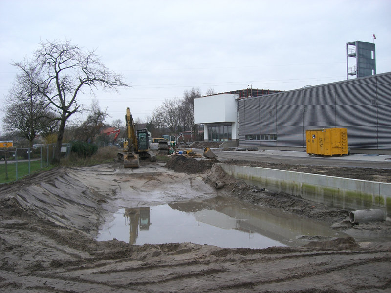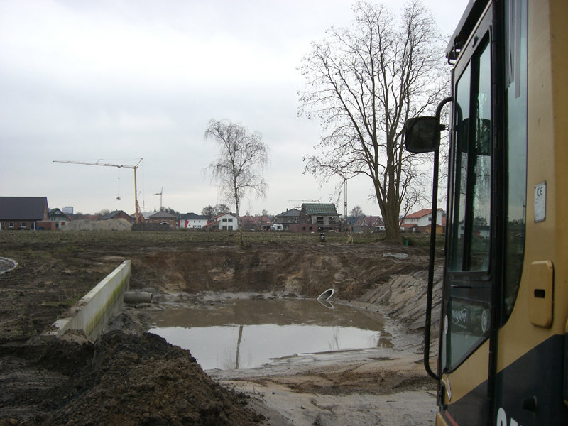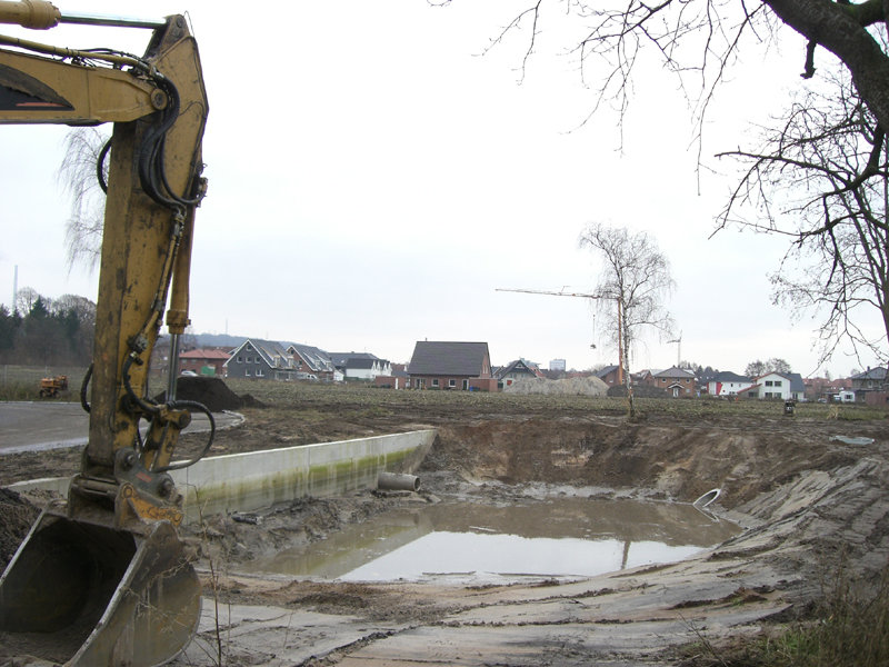 Das Regenrückhaltebecken im Süden des Geländes ist zum Teil schon ausgebaggert – aber wegen des zu hohen Grundwasserspiegels noch nicht tief genug. Dies wird dann im Frühjahr nachgeholt.