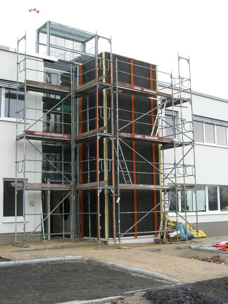 Auch die Treppenhäuser sind bereits von außen isoliert und werden in Kürze mit farbigen Blechtafeln versehen.