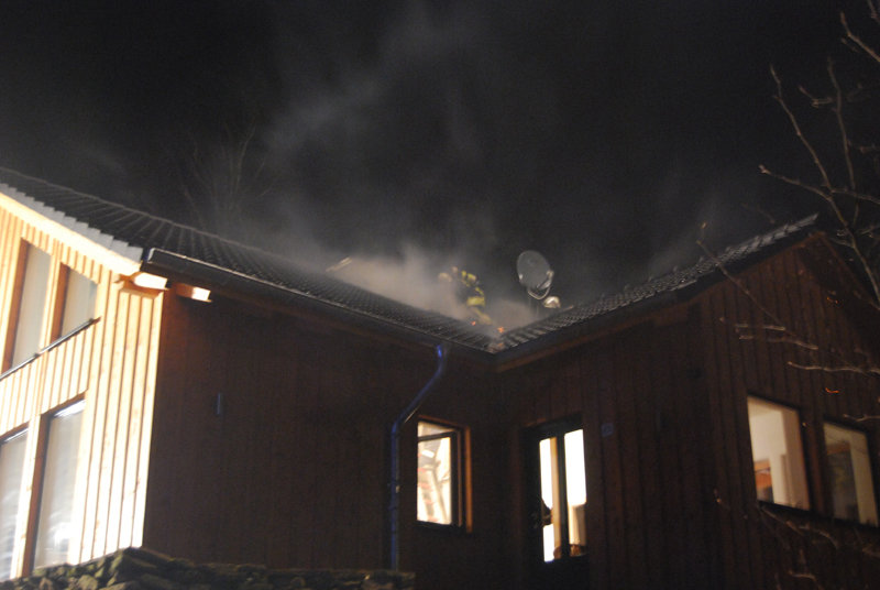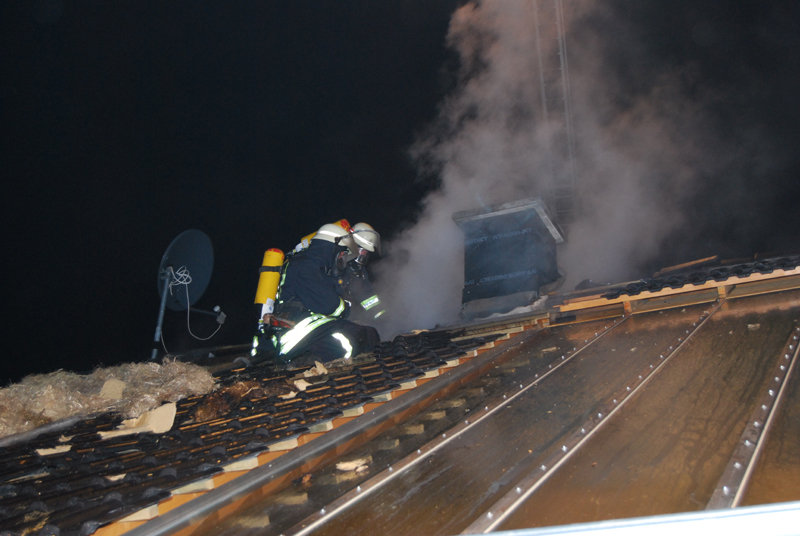 Ein gemeldeter Schornsteinbrand in einem Holzhaus stellte sich als Schwelbrand des Dämm-Materials im Dach- und Wandbereich dar.