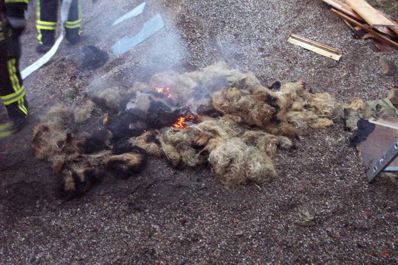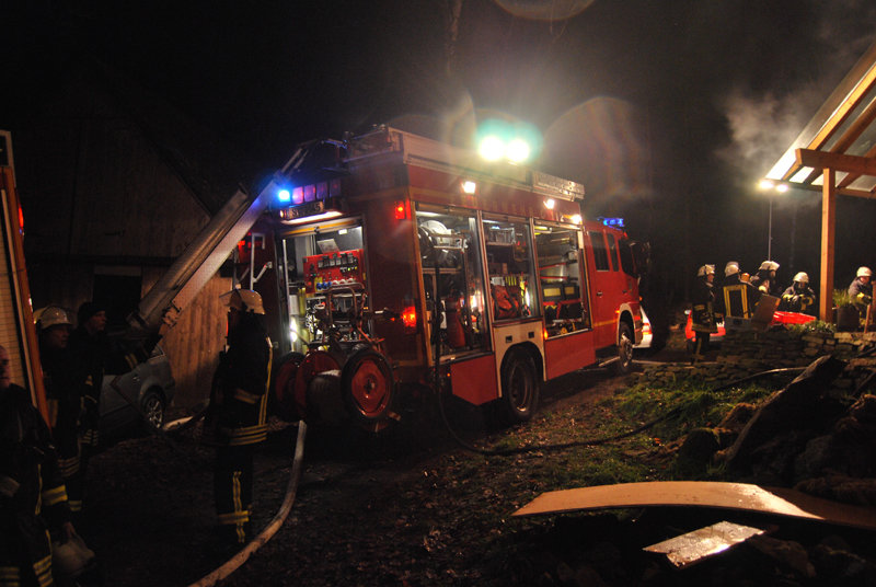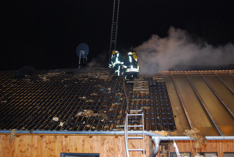 Umfangreiche Löscharbeiten waren erforderlich, bei denen Teile der Dachhaut sowie der Wandverkleidungen geöffnet werden mussten.