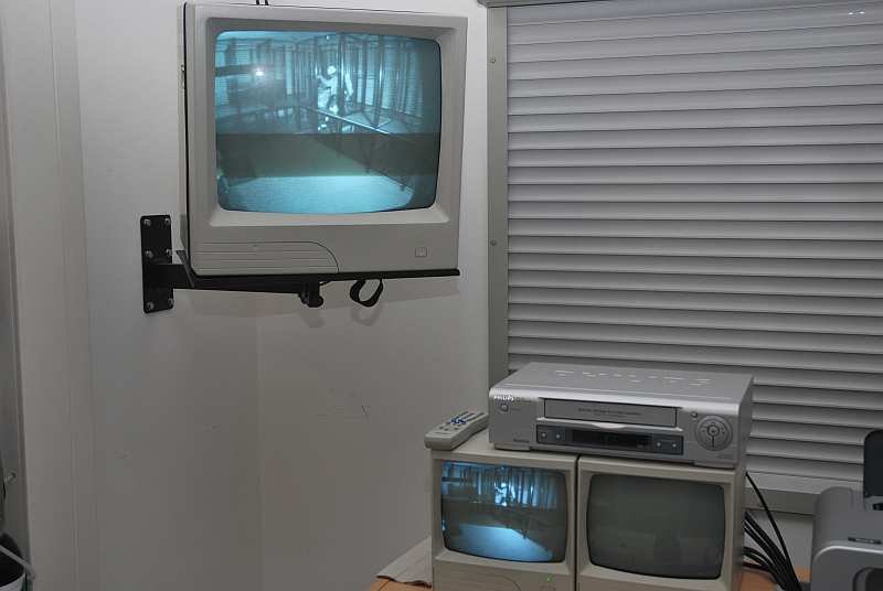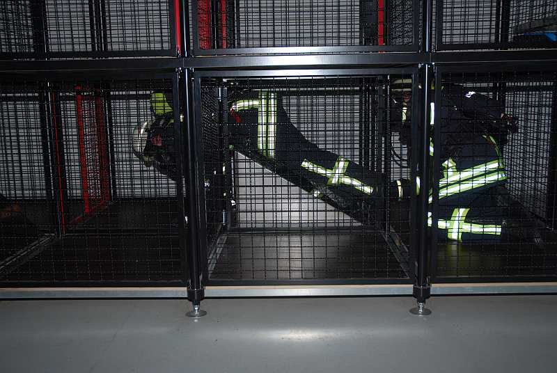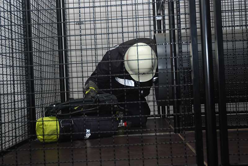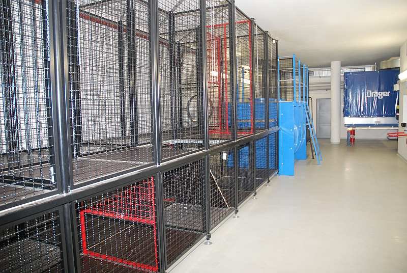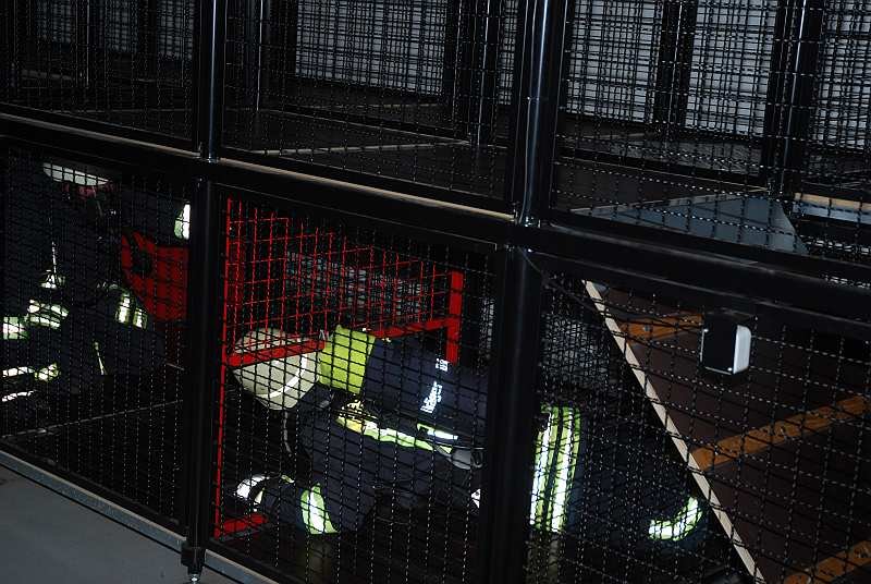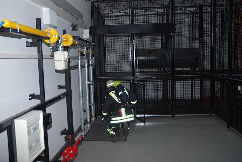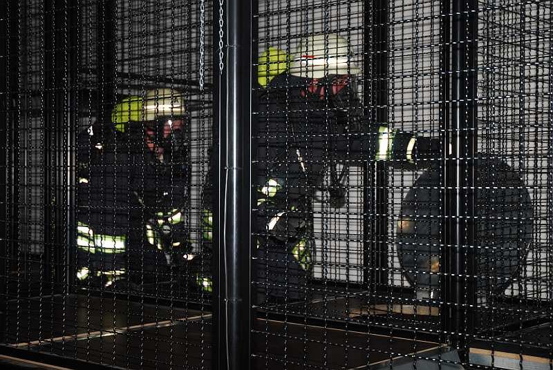 4. Jetzt geht es in die eigentliche Übungsstrecke: Ein Raum, der komplett verdunkelt ist und in dem sich eine Art Irrgarten mit diversen, eingebauten Hindernissen befindet. Der Übungsraum ist durch Heizstrahler auf gut 40 Grad aufgewärmt, mit Einsatzgeräuschen beschallt und wird aus der Zentrale kontinuierlich vom Übungsleiter per Infrarotkameras überwacht. Ein Trupp geht dort immer zu zweit durch die Strecke und muss dabei die Hindernisse, wie zum Beispiel Verengungen, Schrägen, Röhren, Luken nach oben oder unten und diverse Schiebetüren und ähnliches bewältigen, um auf der anderen Seite wieder herauszukommen.