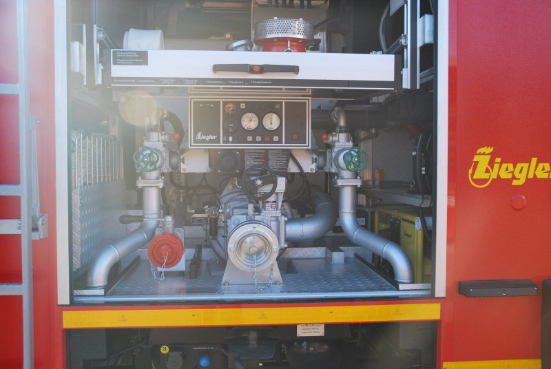 Der zweite Schwerpunkt des Fahrzeuges ist die Löschwasserversorgung. Hierzu wurde eine TS PFPN 10-1000-1 verlastet. Saugleitung, Saugkorb, Sammelstück usw. sind in doppelter Ausführung vorhanden und die Anzahl der B–Schläuche wurde erhöht.