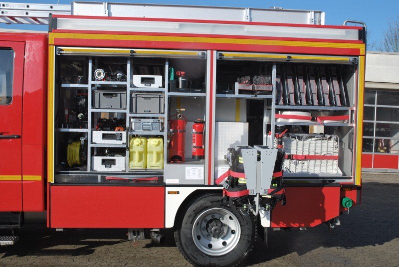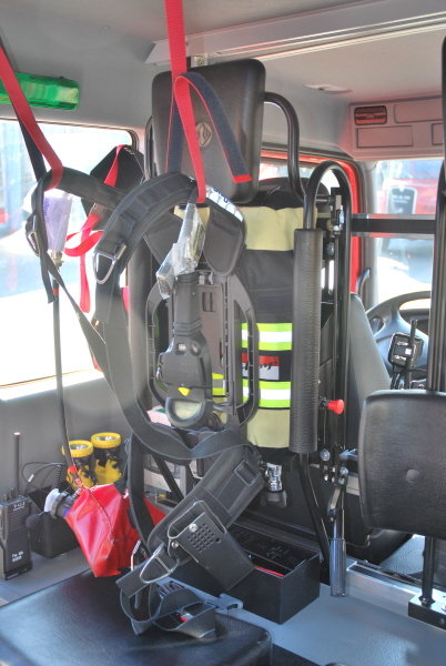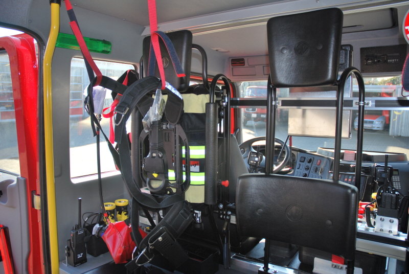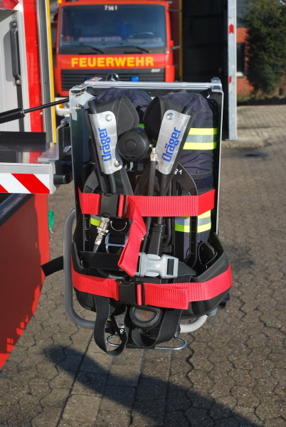 Zum einen ist dies die möglichst schnelle Bereitstellung des Sicherheitstrupps mit Langzeitpressluftatmern. Hierzu wurden zwei solche Geräte im Mannschaftsraum so verlastet, dass sich der Sicherheitstrupp bereits auf der Anfahrt zur Einsatzstelle mit den Zweiflaschengeräten ausrüsten kann.