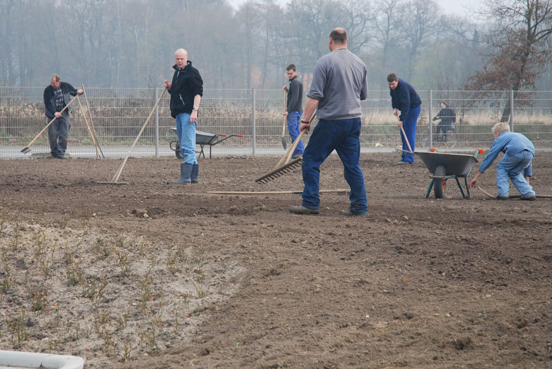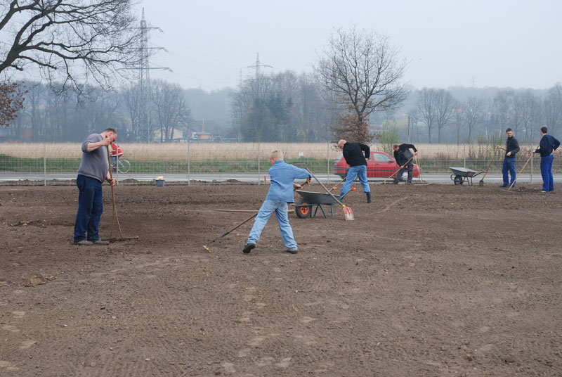 Mit viel Muskelkraft und Ausdauer wurde bis zum späten Nachmittag die nicht gerade kleine Fläche von Steinen befreit, geglättet und schließlich Rasen eingesät.