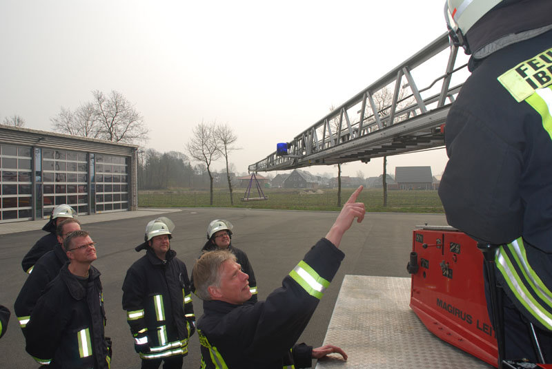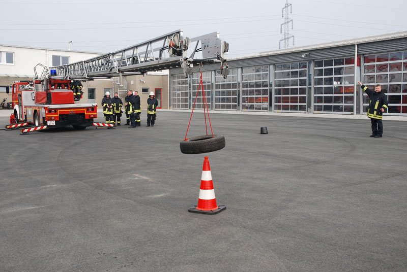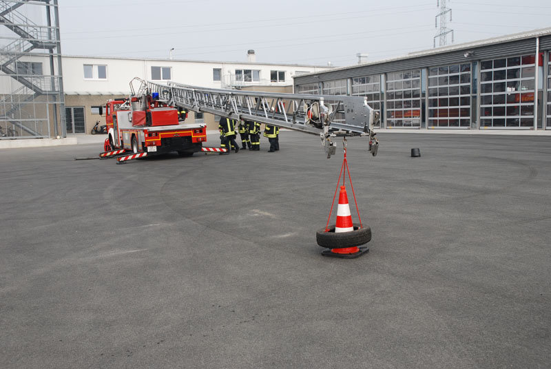 Dank der überschaubaren Teilnehmerzahl konnte jeder der neun Teilnehmer intensiv mit der Drehleiter üben. Hierbei standen praktisches Handling ebenso auf dem Plan wie die korrekte Aufstellung des Fahrzeugs, um bestimmte Punkte trotz Hindernis mit der Leiter anfahren zu können. Stichwort: Horizontal- bzw. Vertikal-Flucht. Besonders Wert gelegt wurde auch auf die Kenntnisse der Leistungsgrenzen der Drehleiter.