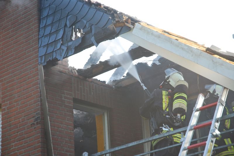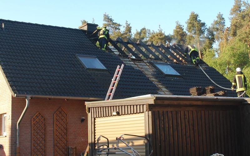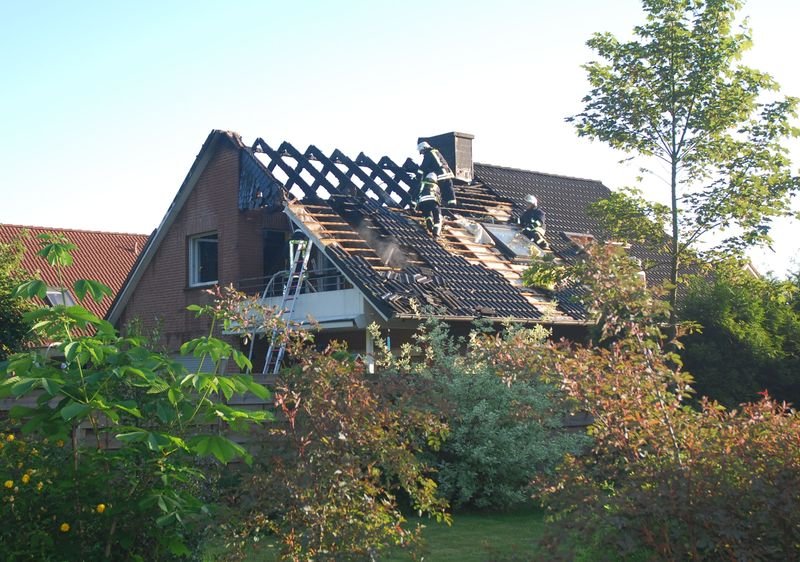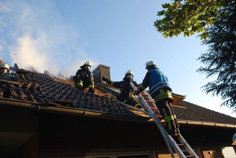 Beim Eintreffen der umgehend ausgerückten ersten Kräfte schlugen bereits Flammen aus dem Dach des Einfamilienhauses. Die Bewohner – zwei Erwachsene und zwei Kinder – hatten sich mit ihrem Hund rechtzeitig und unverletzt in Sicherheit bringen können.