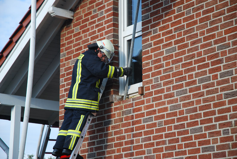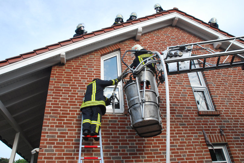 Nachdem noch einige Klinker entfernt worden waren, konnte über die Drehleiter mittels Löschlanzen zum Brandherd vorgedrungen werden. Dieser wurde mit möglichst wenig Wasser bekämpft, dem zur Verminderung der Oberflächenspannung Netzmittel beigefügt war. Die Löschwirkung konnte sehr gut mit der Wärmebildkamera beurteilt werden.