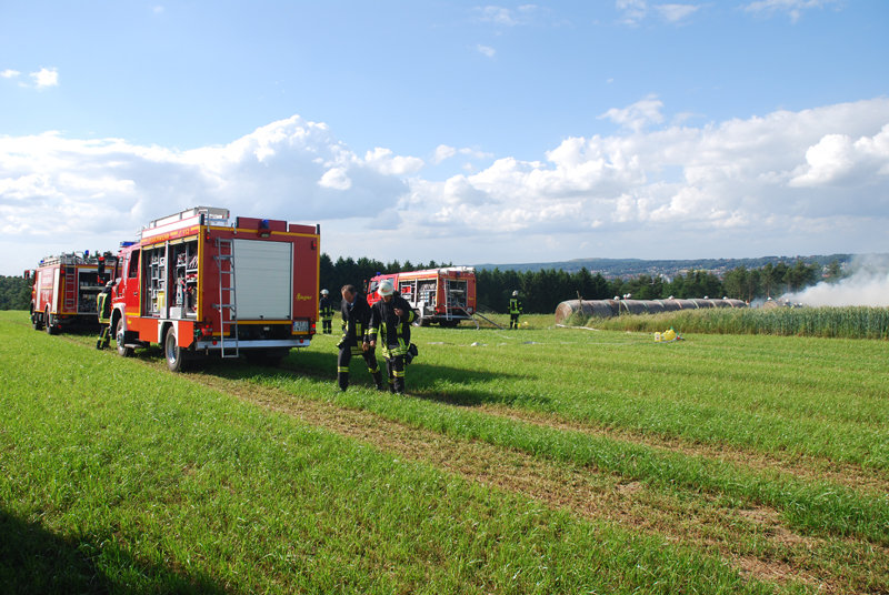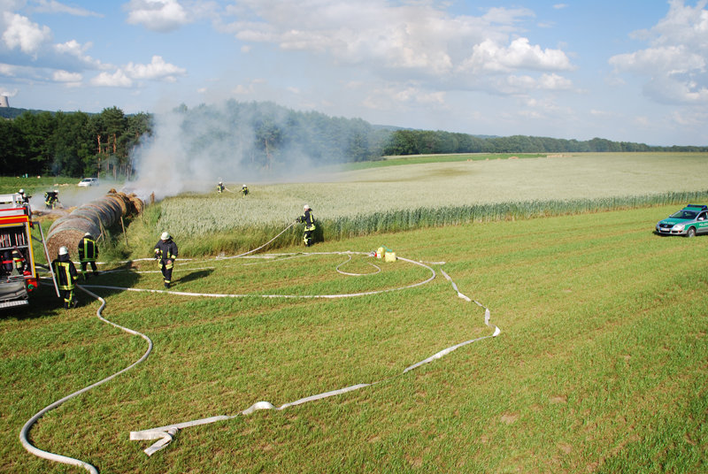 Dort brannten neun Rundballen Stroh, die zwischen einem Erdbeer- und Kornfeld gelagert waren.
