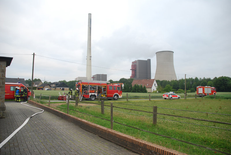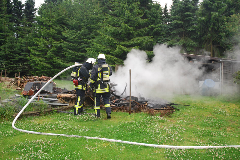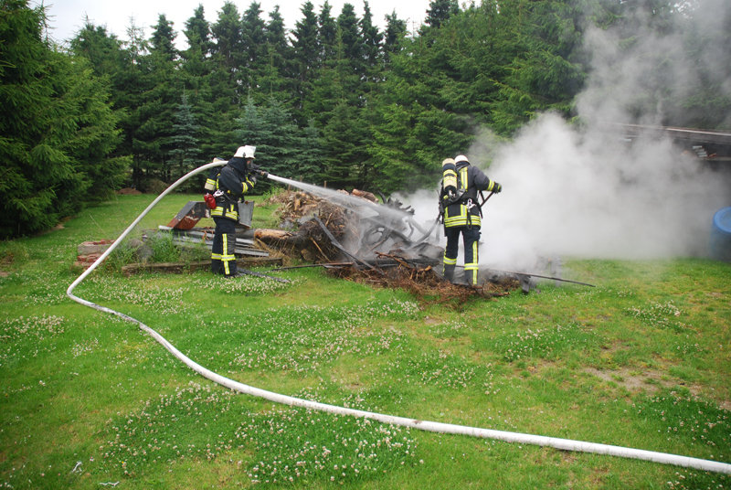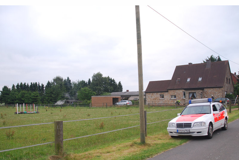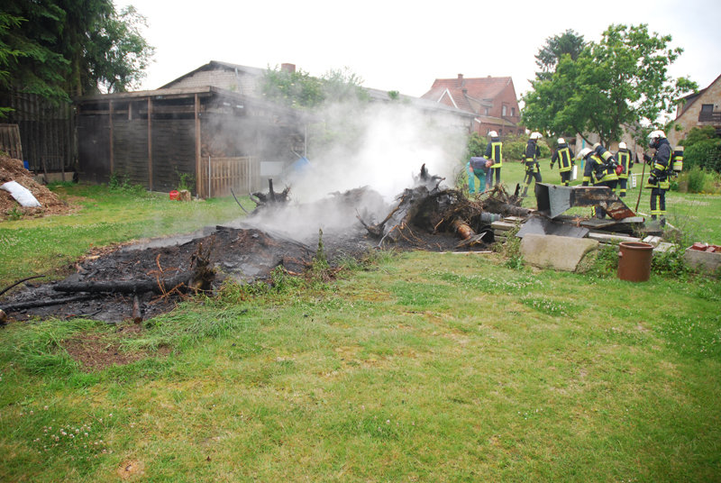 Einem Anwohner waren seine gesammelten Grünabfälle im Garten in Brand geraten. Der Pferdestall war nicht betroffen. Ein Trupp unter PA mit einem C-Rohr vor.