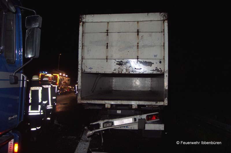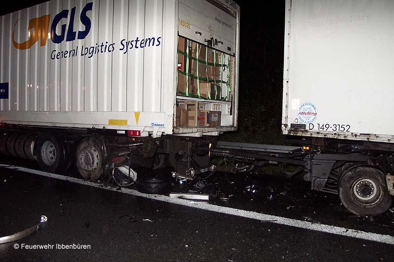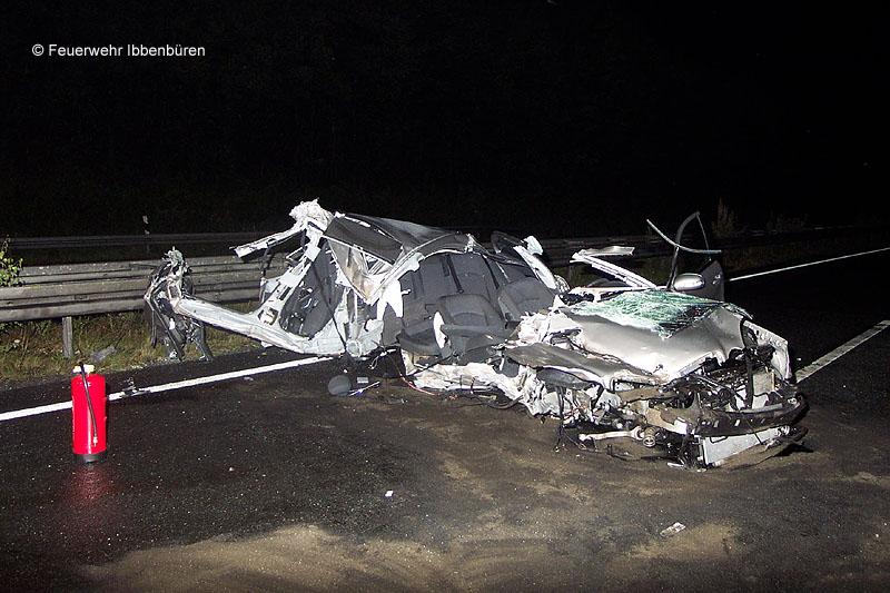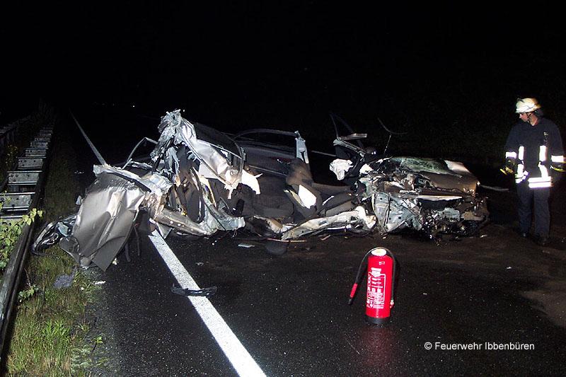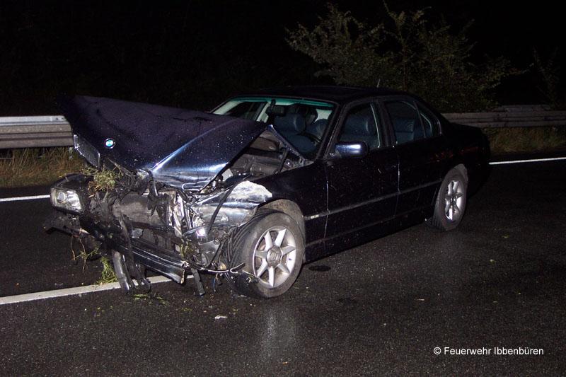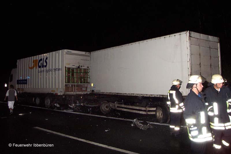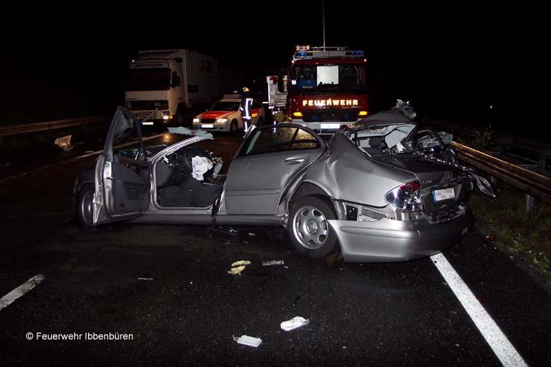 Die Löschzüge Stadtmitte 1 und 2 der Freiwilligen Feuerwehr Ibbenbüren wurden heute Nacht gegen 02:20 Uhr zu einem Verkehrsunfall mit einer eingeklemmten Person alarmiert.Auf der BAB 30, Fahrtrichtung Hannover zwischen den AS Laggenbeck und Lotte hatte nach neuen Erkenntnissen zunächst ein LKW einen seiner Diesel-Kraftstofftanks verloren. Ein nachfolgender Pkw (BMW) konnte nicht mehr ausweichen und kollidierte mit dem Tank.