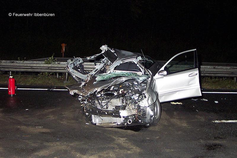 Ein weiterer Pkw (Mercedes) konnte vor der Unfallstelle ebenfalls nicht mehr rechtzeitig anhalten und streifte zunächst einen am Unfallfahrzeug stehenden Insassen des BMW. Anschließend prallte er mit dem LKW zusammen. Dabei wurde der Fahrer des Mercedes in seinem völlig zerstörten Wagen eingeklemmt, konnte aber von der Feuerwehr ohne technisches Gerät befreit werden. Er wurde - wie auch die verletzte Person aus dem BWM - an der Einsatzstelle notärztlich behandelt und mit dem RTW in ein Krankenhaus gebracht.