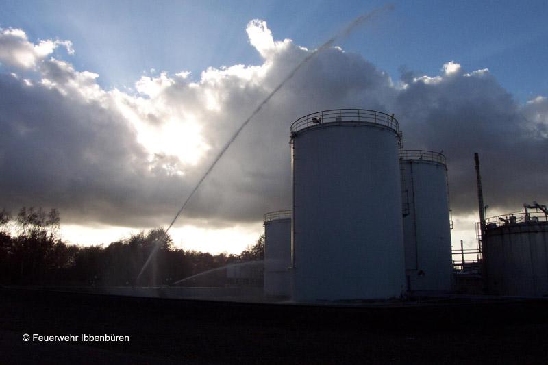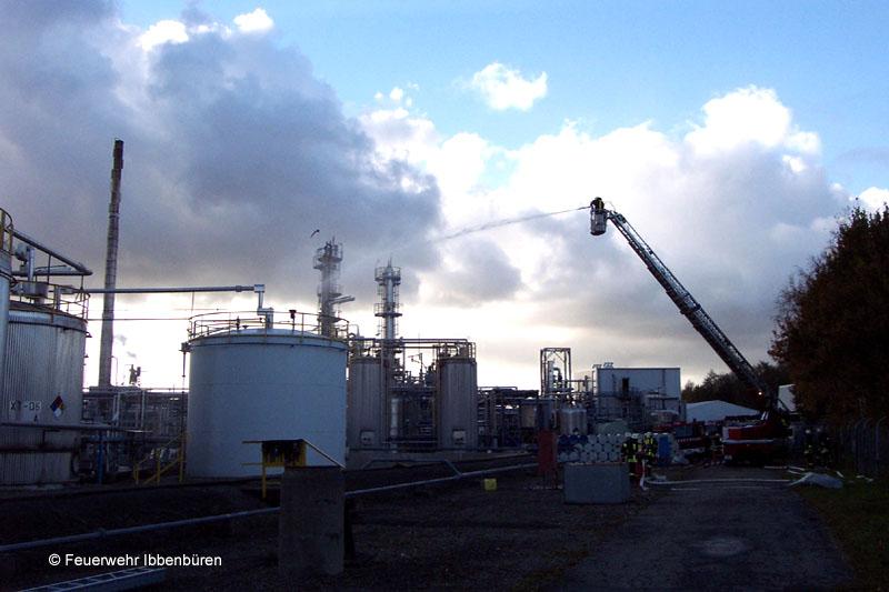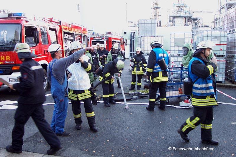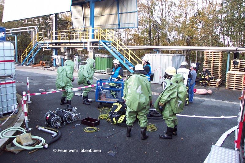 Am Samstag dem 06. November 2004 fand eine Übung aller vier Löschzüge der Feuerwehr Ibbenbüren im Industriegebiet Uffeln bei der Firma ANGUS Chemie GmbH statt.Die angenommen Lage bestand aus zwei Übungsteilen: Zum einen war eine Person bei Ladearbeiten vom Gabelstapler gefallen und lag verletzt und eingeklemmt zwischen Fässern mit brennbarer Flüssigkeit. Zum anderen wurde angenommen, dass ein großer Flüssigkeitstank im Freigelände brannte.