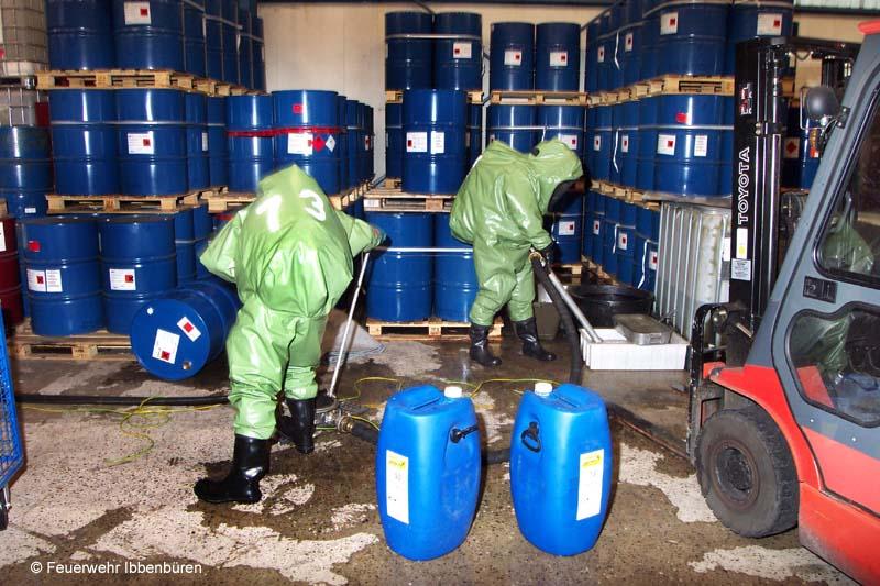 Da bei dem Staplerunfall ein Fass Leck geschlagen war, wurden Trupps unter CSA zum Auffangen, Umfüllen und Abdichten des Behälters eingesetzt. Hierbei wurden Schwierigkeiten bei der Erdung des Schlauchmaterials deutlich. Die Dekontamination übernahmen die Spezialisten des DekonP vom Löschzug Döhrente.