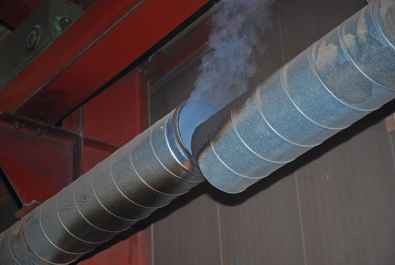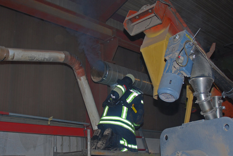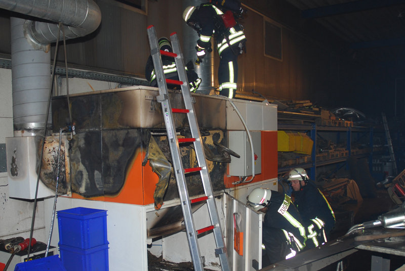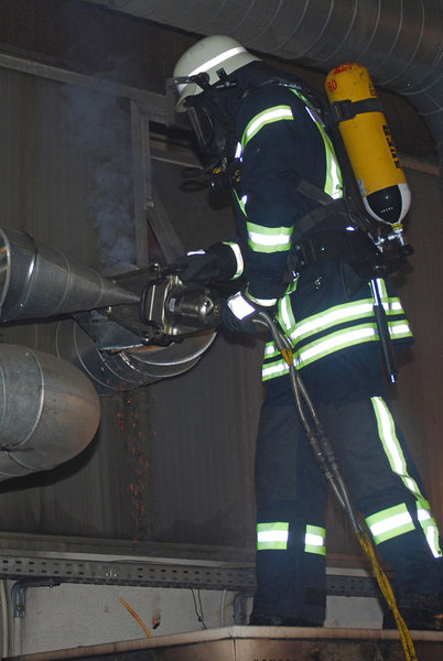 In einer Absauganlage für Späne war ebenfalls ein Brand ausgebrochen. Diese musste mit schwerem, hydraulischem Gerät geöffnet werden, bevor Trupps unter PA diese ablöschen und das Brandgut entfernen konnten.