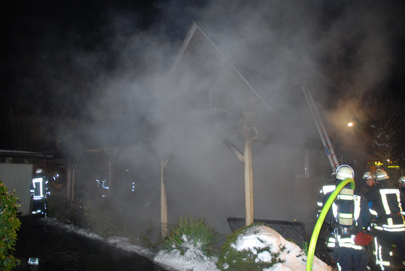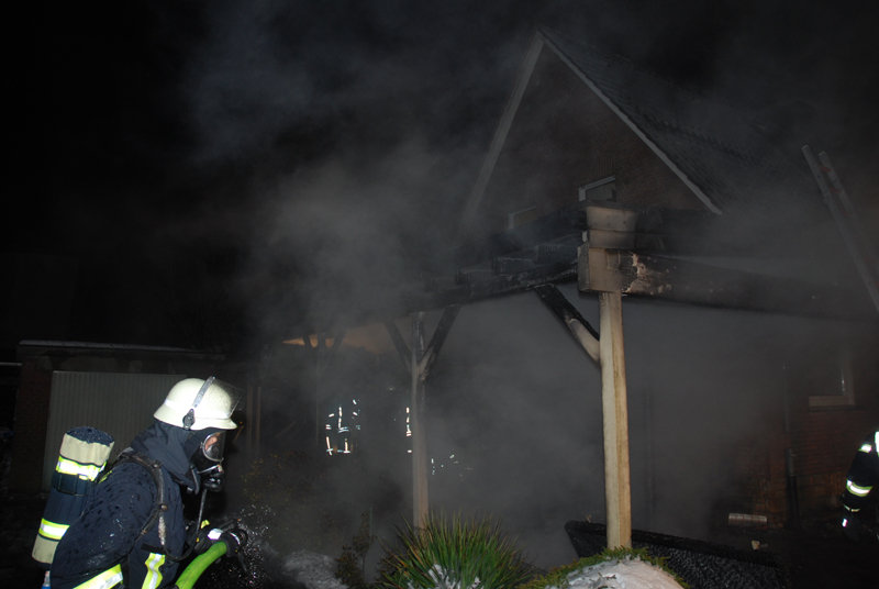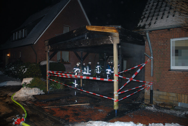 Zwischen zwei Einfamilienhäusern brannte ein Holzcarport in voller Ausdehnung. Da das Carport direkt an das Wohnhaus angebaut war, drohten die Flammen darauf überzugreifen. Es war kein Fahrzeug untergestellt.