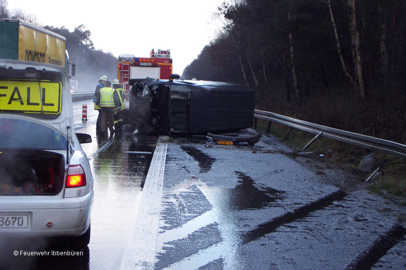 Der Löschzug Stadtmitte 2 der Feuerwehr Ibbenbüren wurde am Mittwochnachmittag gegen 14:40 Uhr zu einem Verkehrsunfall mit Lkw alarmiert.Nach einem sehr heftigen Hagelschauer war ein Kleintransporter aus bisher ungeklärter Ursache verunglückt und dabei auf der Fahrzeugseite zum Liegen gekommen. Es war jedoch niemand eingeklemmt und es liefen auch keine Betriebsstoffe aus, so dass sich die Arbeit der Feuerwehr auf das Abklemmen der Fahrzeugbatterie beschränkte.