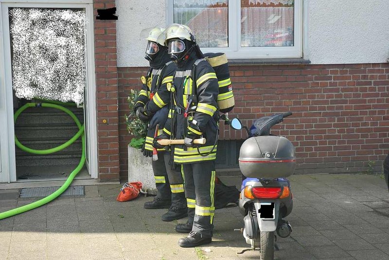 Zwei Trupps unter Atemschutz mit einem C-Rohr gingen zur Brandbekämpfung durch den Treppenraum vor.