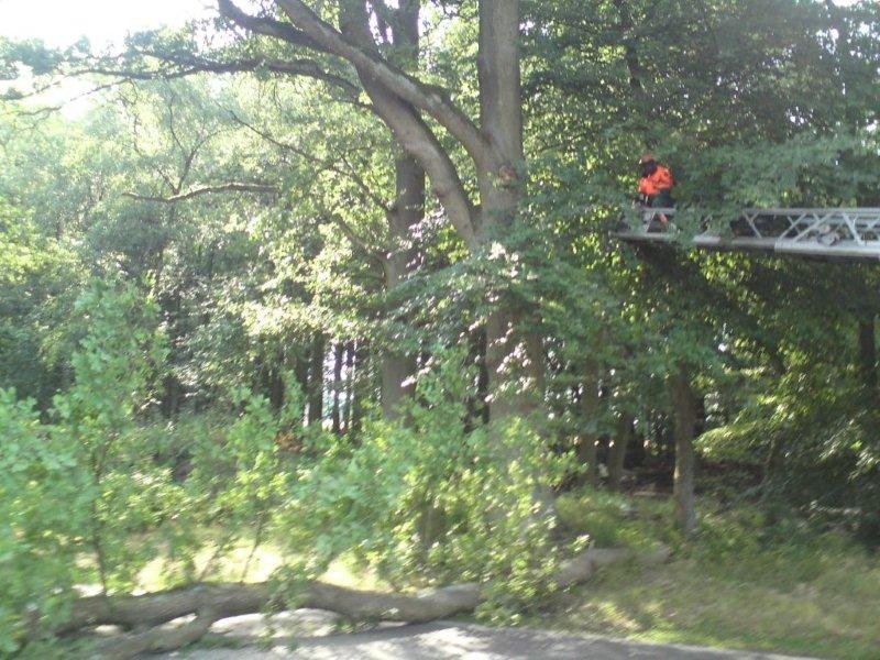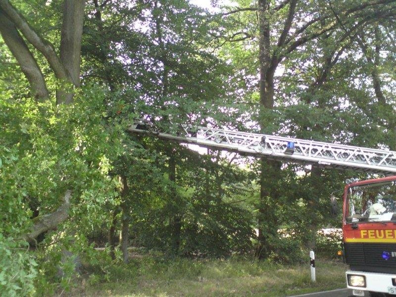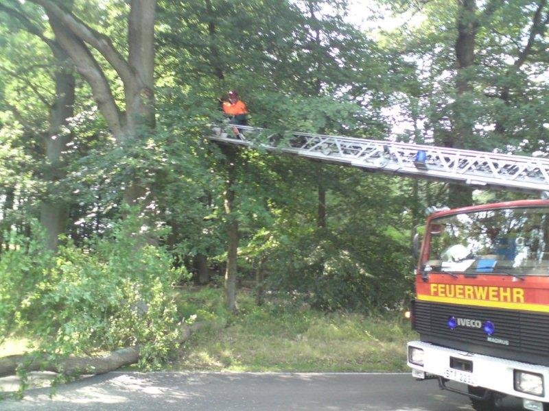 -ms- Ein Ast war aus einem Baum herausgebrochen und versperrte die komplette Fahrbahn. Mit Hilfe der DLK konnte der Motorsägenführer den noch am Baum festhängenden Ansatz und den Ast selbst entfernen.