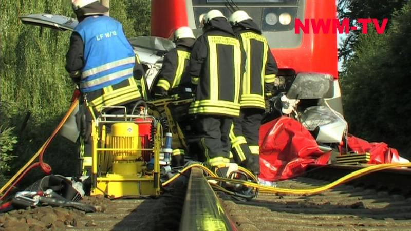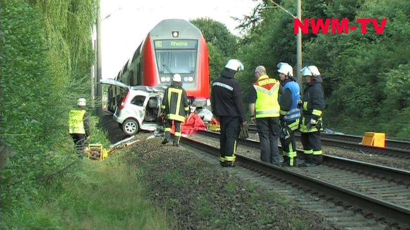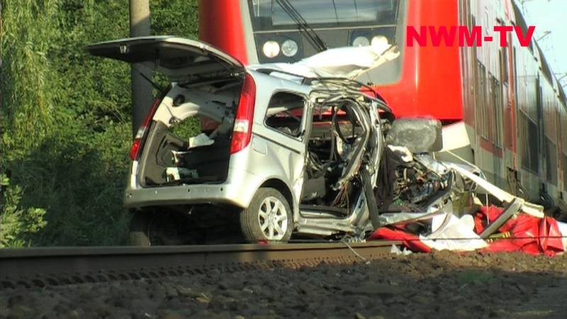 Ein Pkw war beim Überqueren des Bahnübergangs Glücksburger Straße von einem Zug in Fahrtrichtung Rheine erfasst und rund 400 Meter weit mitgeschleift worden. Der völlig zerstörte Pkw steckte unter dem Zug fest.