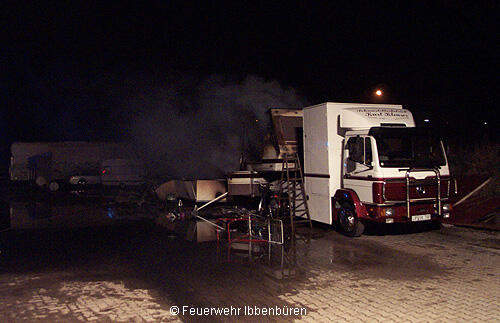 "Brennt Wohnmobil" war das Alarmstichwort am Ostermontag um 04.14 Uhr für den LZ Stadtmitte 1: Auf dem Gelände einer ehemaligen Landmaschinenfirma fanden die ersten Kräfte einen brennenden Wohnwagen in Form eines Sattelaufliegers vor. Er brannte bereits in voller Ausdehnung. Es waren keine Personen im Fahrzeug.Der Zugwagen sowie ein angrenzend stehender weiterer Wohnwagen wurden durch die Feuerwehr gehalten. Ein dritter Wohnwagen konnte per Hand aus dem Gefahrenbereich verbracht werden.