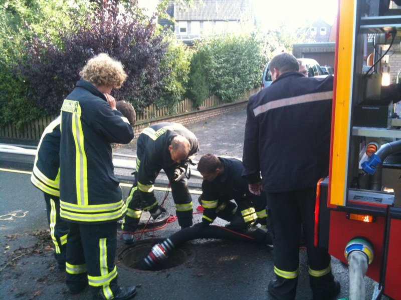 Mit dem LF10/6 des Löschzuges Stadtmitte waren wir in der Görlitzer Straße eingesetzt und hatten die Aufgabe mit der Fahrzeugpumpe und der Tragkraftspritze zwei Abwasserschächte auf einem gleichbleibenden Wasserstandsniveau zu halten.