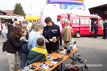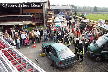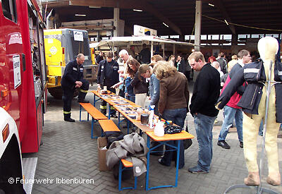 Auf dem Gelände der Schreinerei Schrameyer wurde das LF 16/12 und der ELW 1 den Besuchern vorgestellt. Mit eigenen Einsatzbildern aus der Ibbenbürener Umgebung sowie angegezündeten Legosteinen und Teddybären gelang es den interessierten Besuchern Rauchmelder "schmackhaft" zu machen. Erfreut konnten die Kräfte feststellen, dass die Bürger immer mehr Verständnis für die Notwendigkeit von Rauchmeldern aufbringen und diese oft auch schon installiert sind.