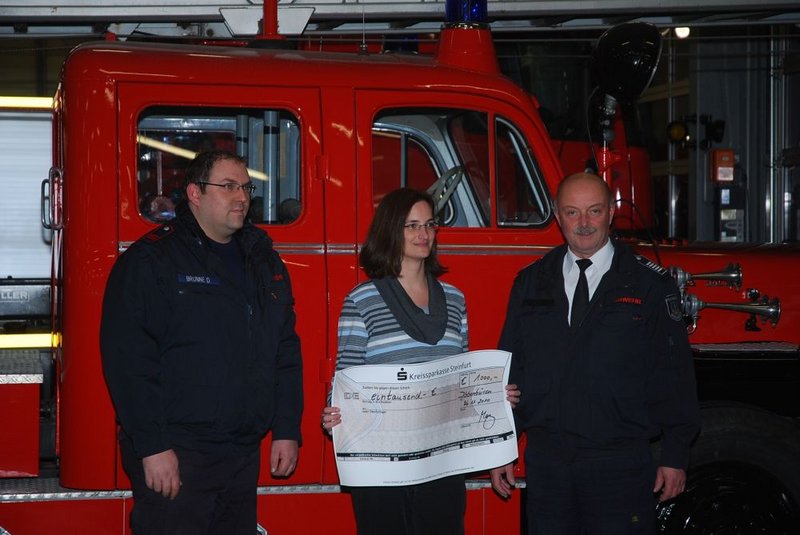 Zum Abschluss überreichte die Leiterin der Hauptstelle der Kreissparkasse, Frau Sonja May, dem Leiter der Feuerwehr Ibbenbüren, Heiner Löpmeier, einen Scheck in Höhe von 1.000,- Euro. Mit dem Geld soll die Restaurierung der alten Drehleiter mitfinanziert werden.