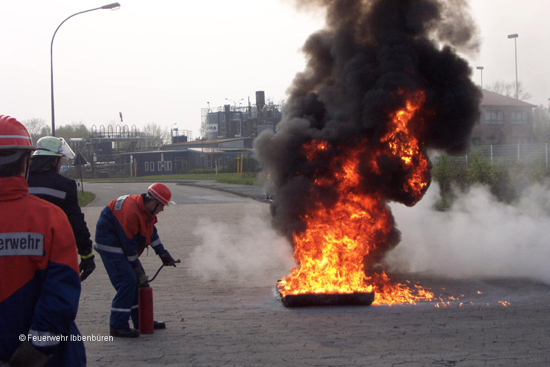 -ms- Ibbenbüren. Die Feuerlöscherausbildung ist mit ein wichtiger Bestandteil der Feuerwehrausbildung. Gerade weil der Einsatz eines Feuerlöschers in der Entstehungsphase eines Brandes sehr wichtig ist, sollte jeder Feuerwehrmann (SB) im Umgang mit einem solchen Gerät vertraut sein.So werden natürlich auch und gerade unsere jüngeren Kameraden der Jugendfeuerwehr im Umgang mit Feuerlöschern geschult. Nach einer umfangreichen theoretischen Ausbildung über Kleinlöschgeräte und im Besonderen Feuerlöschern, war es dann mal wieder soweit: Der praktische Übungsdienst stand auf dem Programm.