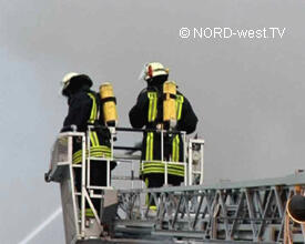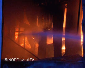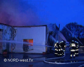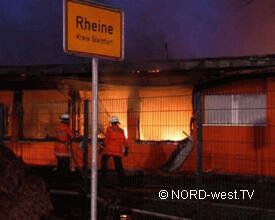 An der Einsatzstelle war bereits gegen 3:50 Uhr ein Feuer im Büro- und Lagergebäude einer Import-Export-Firma ausgebrochen. Schnell hatten sich die Flammen ausgebreitet und bei Eintreffen der Kameraden aus Rheine stand die etwa 30 mal 70 Meter große Halle bereits in Vollbrand. Um fünf Uhr brach das Dach der Halle zusammen und die eingesetzten Kräfte konnten nur noch versuchen, die angrenzenden Gebäude in dem Gewerbegebiet am Hafen zu sichern. Von beiden Drehleitern (Ibbenbüren und Rheine) wurden Wenderohre vorgenommen.