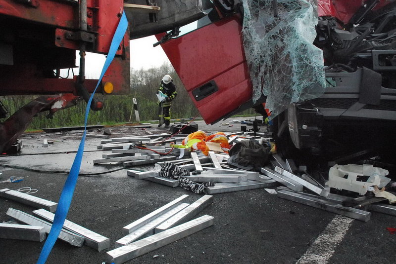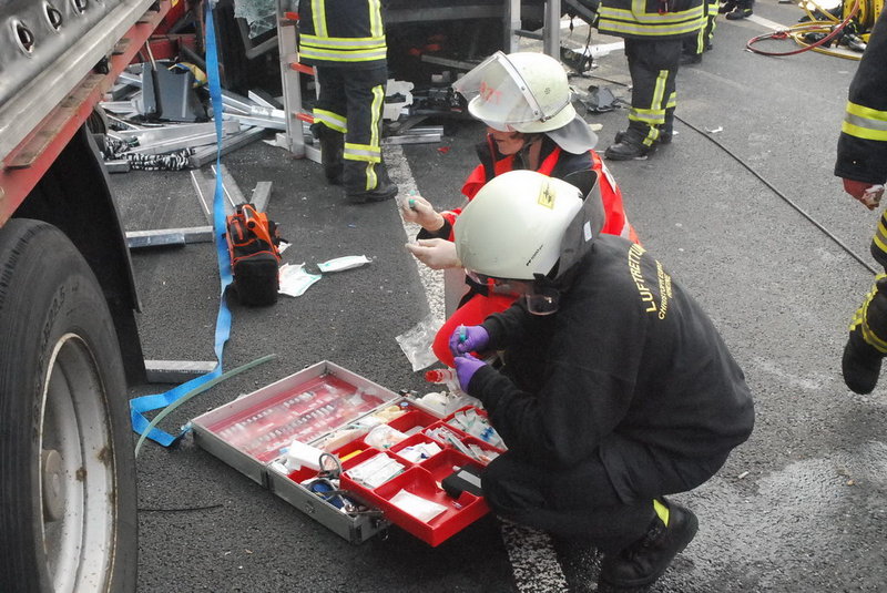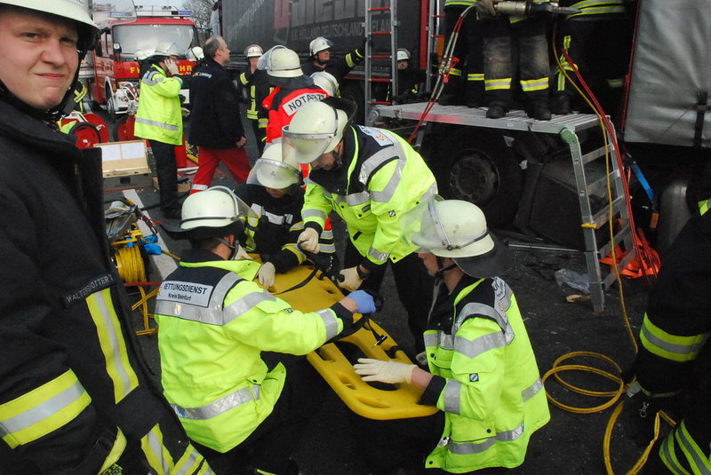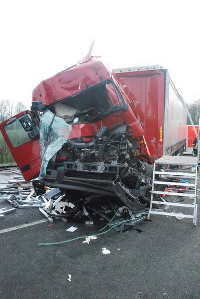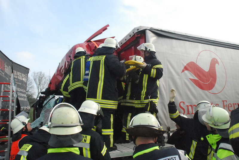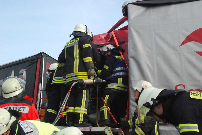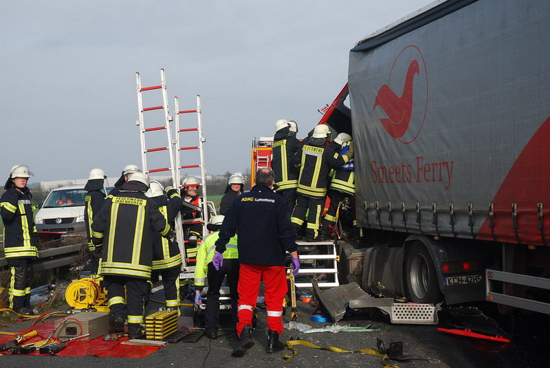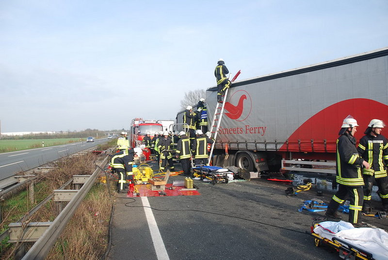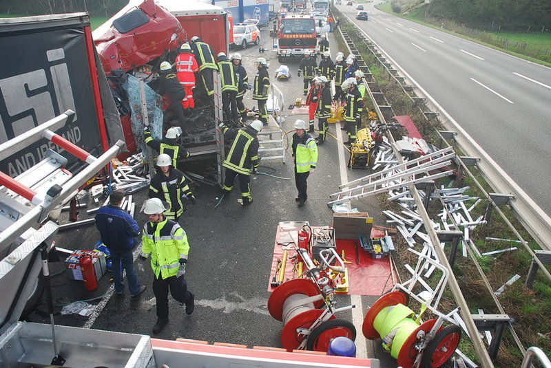 Auf der Bundesautobahn 30, Fahrtrichtung Hannover, war kurz hinter dem Rastplatz Brockbachtal ein LKW auf einen anderen LKW aufgefahren, wodurch der Fahrer schwer in seinem Fahrzeug eingeklemmt wurde.