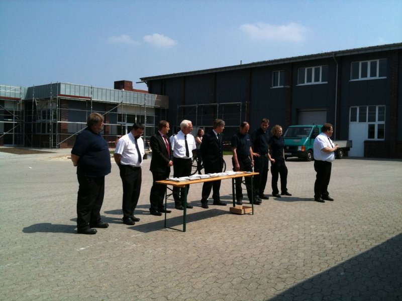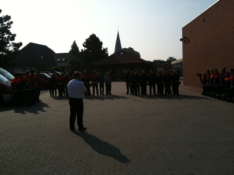 Nachdem alle Teilnehmer ihre Prüfungen erfolgreich absolviert hatten, wurde zur Verleihung der Abzeichen nochmals komplett angetreten. Neben den schon erwähnten Gästen hatten sich auch der Bürgermeister der Stadt Tecklenburg Stefan Streit und der Vorsitzende des Verbandes der Feuerwehren im Kreis Steinfurt Norbert Stegemann eingefunden.