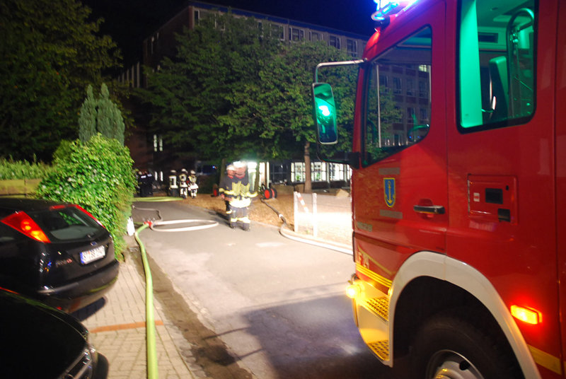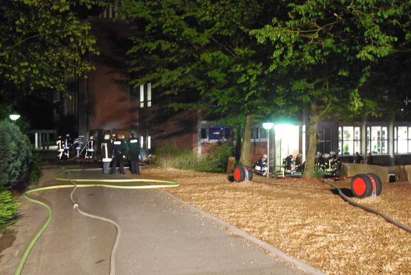 Da nicht auszuschließen war, dass Rauch und Flammen im Gebäudeinneren Schaden angerichtet haben, mussten umgehend weitere Trupps im Schulgebäude vorgehen. Der Löschzug Stadtmitte 1 wurde nachalarmiert. Eine Wasserversorgung wurde mittels Unterflurhydrant aufgebaut.
