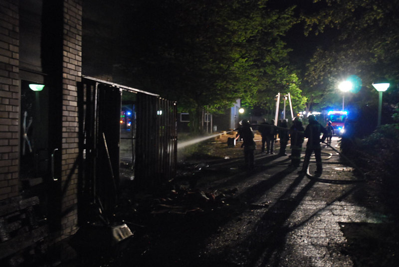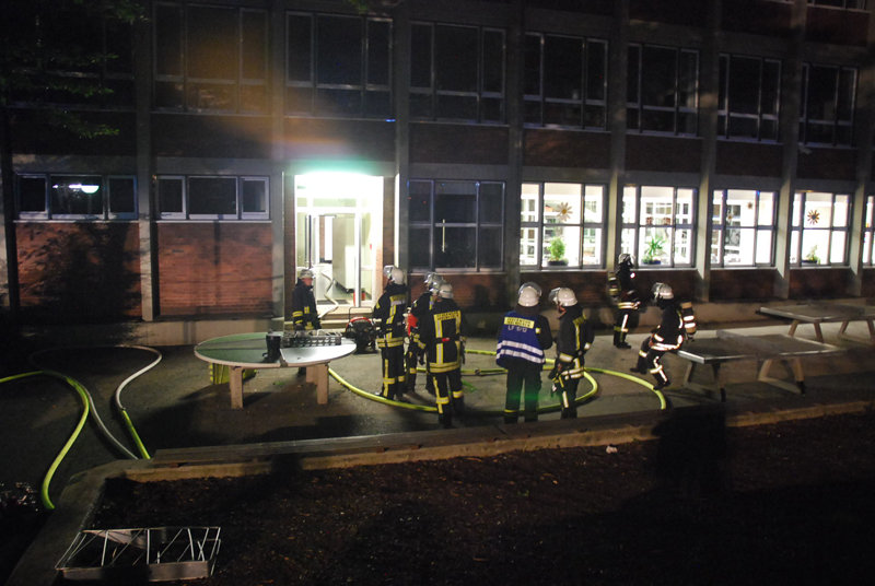In voller Ausdehnung brannte Müll an und in einem hölzernen Anbau von rund 20 m² Fläche, der direkt an das Schulgebäude grenzte. Durch einen Trupp unter PA wurden die Flammen schnell gelöscht. Dabei wurde erkennbar, dass mehrere Fenster im Schulgebäude vom Feuer zerstört worden waren.
