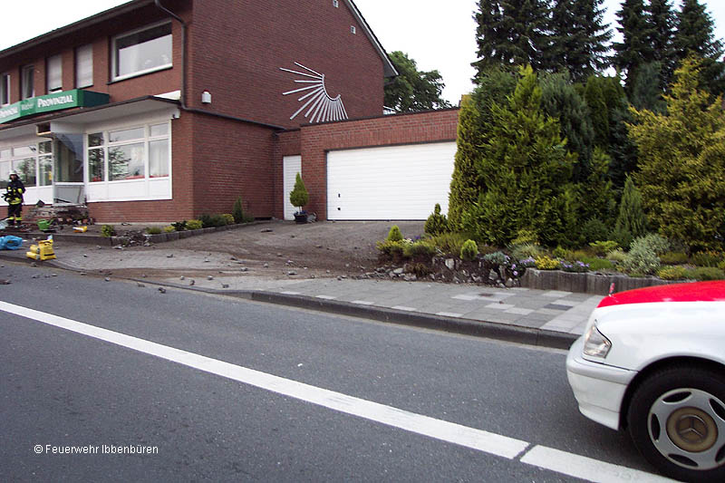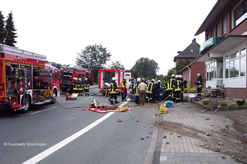 Die Löschzüge Laggenbeck und Stadtmitte 1 der Feuerwehr Ibbenbüren wurde am Sonntagmorgen, um 06:22 Uhr, zur technischen Hilfe nach einem Verkehrsunfall mit einer eingeklemmten Person alarmiert. Außerdem sollte das Fahrzeug eventuell brennen.In einer leicht ansteigenden Linkskurve der Tecklenburger Straße in Laggenbeck war ein 19-jährige Fahrer mit seinem Pkw in Fahrtrichtung Ledde nach rechts von der Straße abgekommen und an ein Wohn- und Geschäftshaus bzw. dessen Außentreppe geprallt.