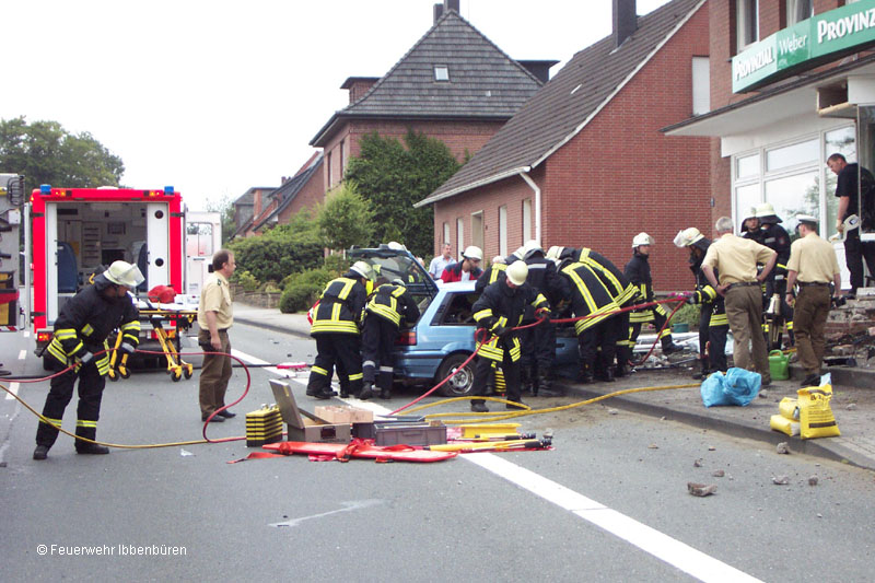 Während der Fahrer nur leichte Verletzungen davon trug, wurde der 17-jährige Beifahrer in dem demolierten Wagen lebensgefährlich verletzt eingeklemmt. Er musste von der Feuerwehr mit hydraulischen Gerät befreit werden (es kamen sowohl Schere und Spreizer als auch zwei Rettungszylinder zum Einsatz). Noch vor dem Eintreffen der ersten Kräfte hatte ein Anwohner kleinere Flammen aus dem Motorraum löschen können.