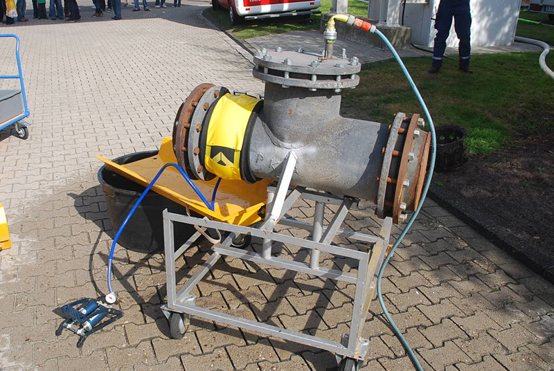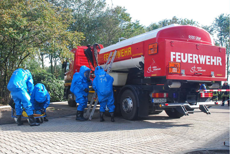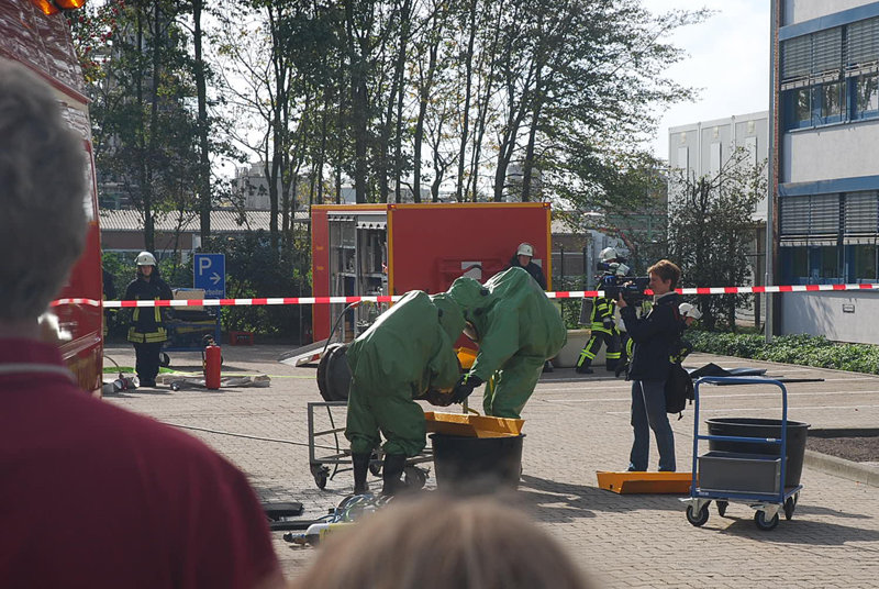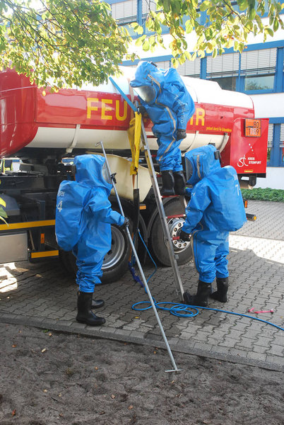 Bei zwei Schauübungen - passend zum "Einsatzort" Chemiepark - wurden Leckagen an einer Rohrleitung bzw. an einem Tankwagen angenommen, die von Trupps in CSA (Chemikalienschutzanzügen) bekämpft wurden.