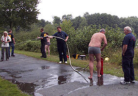 Bürgermeister Heinz Steingröver übernahm als Schirmherr der Veranstaltung die Eröffnung des Wettkampfs auf dem Parkplatz am Aasee. Insgesamt acht Spiele rund um den Aasee hatte sich die Ibbenbürener Jugendfeuerwehr ausgedacht. Vom Spielzeugautorennen an der Skate-Anlage bis hin zum Mülltonnenparcours am Tretbootverleih mussten die 18 Roßlauer und zwölf Ibbenbürener ihre Geschicklichkeit beweisen. Beim Zielen mit dem Wasserschlauch auf eine "brennende" Schule konnten sie auf ihre Fähigkeiten als Feuerwehrmänner zurückgreifen. Beim Torwandschießen, Boot fahren und Ballon aufblasen hingegen musste auch viel Glück im Spiel sein, damit die vier- bis fünfköpfigen Mannschaften eine gute Zeit erreichen und damit viele Punkte sammeln konnte.