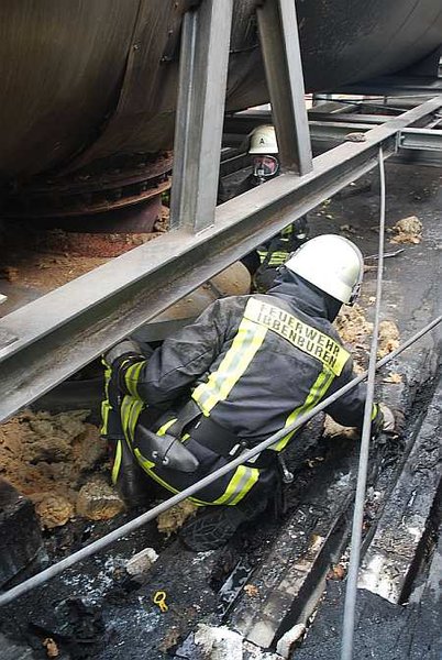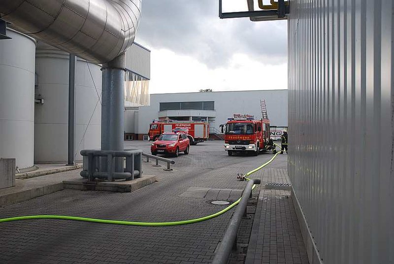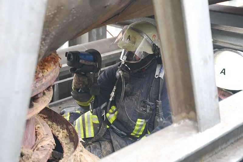 Auf dem Dach montierte Filterschränke und isolierte Rohrsysteme wurden in Mitleidenschaft gezogen. Ein Trupp unter Atemschutz übernahm die von Betriebsangehörigen begonnenen Löscharbeiten und öffnete die brandbeaufschlagten Blechisolierungen um nach weiteren Glutnestern unter Zuhilfenahme der Wärmebildkamera suchen zu können.
