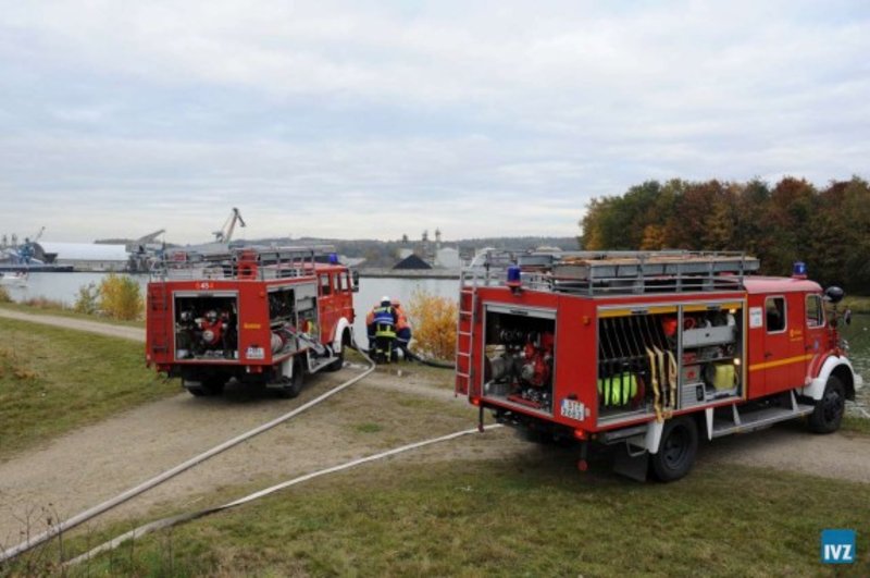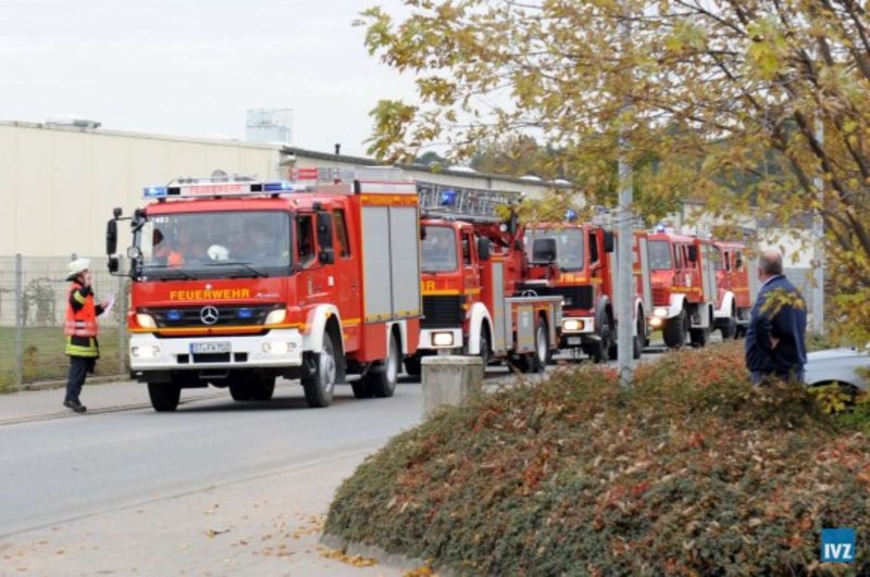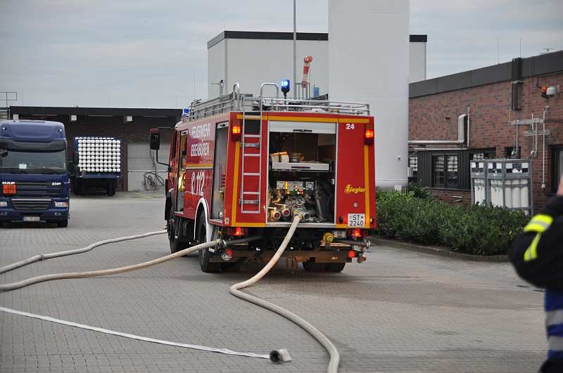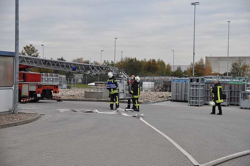 Die Drehleiter und das TLF24/50 waren direkt ab Eintreffen auf dem Werksgelände eingesetzt worden.