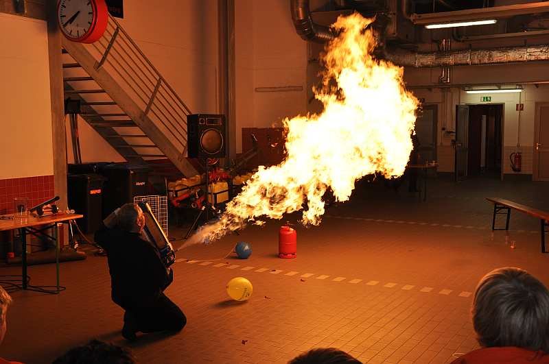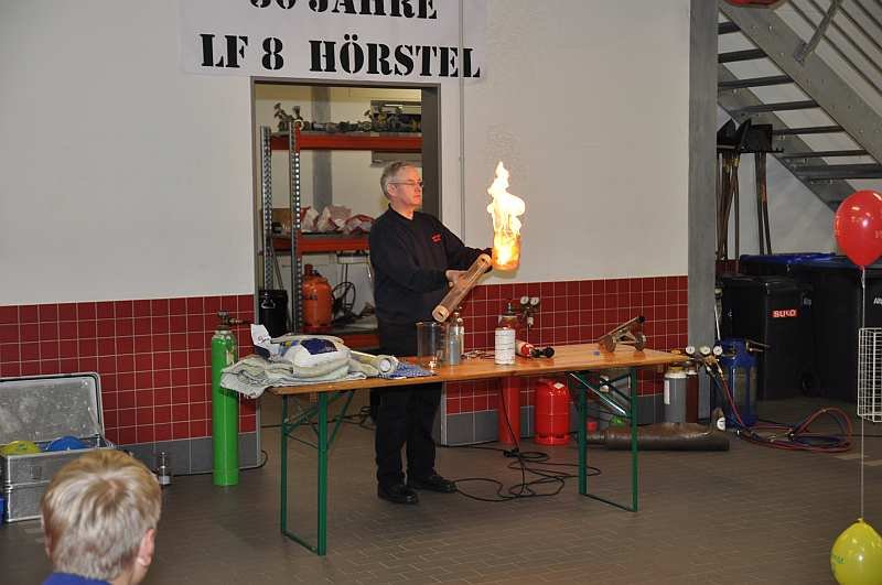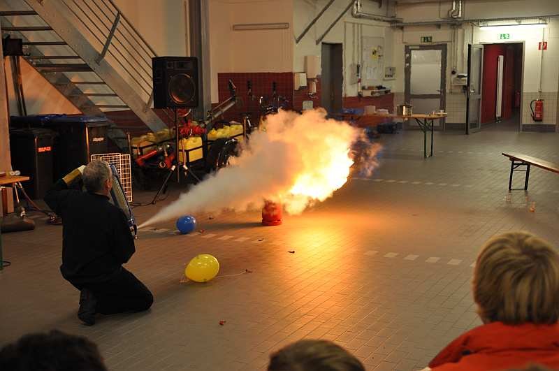 Dr. Volker Frey, von der Westfalen AG und als Fachberater Chemie bei der Feuerwehr Hörstel tätig, führte noch einige Experimente mit verschieden Gasen vor und begeisterte alle Anwesenden mit heftigen Explosionen und Interessantem rund um das Thema Gase.