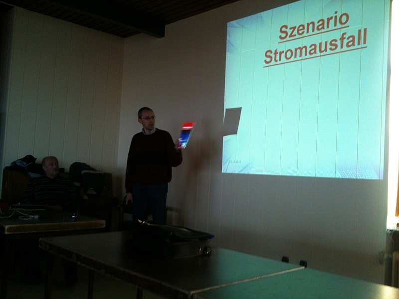Brandamtman Andreas Falkenreck hatte sich das Szenario Stromausfall auf seine Fahne geschrieben. Dabei ging es nicht um die halbe Stunde, in der es schon mal keinen Strom mehr gibt, sondern was passiert wenn der Strom für einen Tag, zwei Tage, eine Woche oder gar für einen Monat ausfallen würde. Im Besonderen ging er auf die Auswirkungen in der Telekommunikation ein.